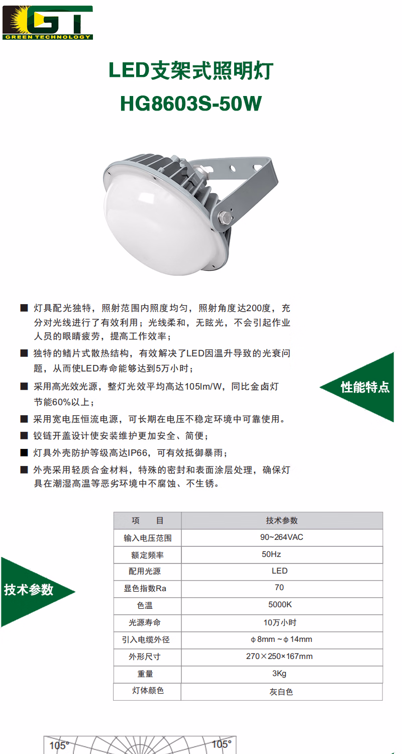 吉特(GT) HG8603S-50W 50W IP66 电压90~264VAC LED 色温5000K LED支架式照明灯 (计价单位:个) 灰白色