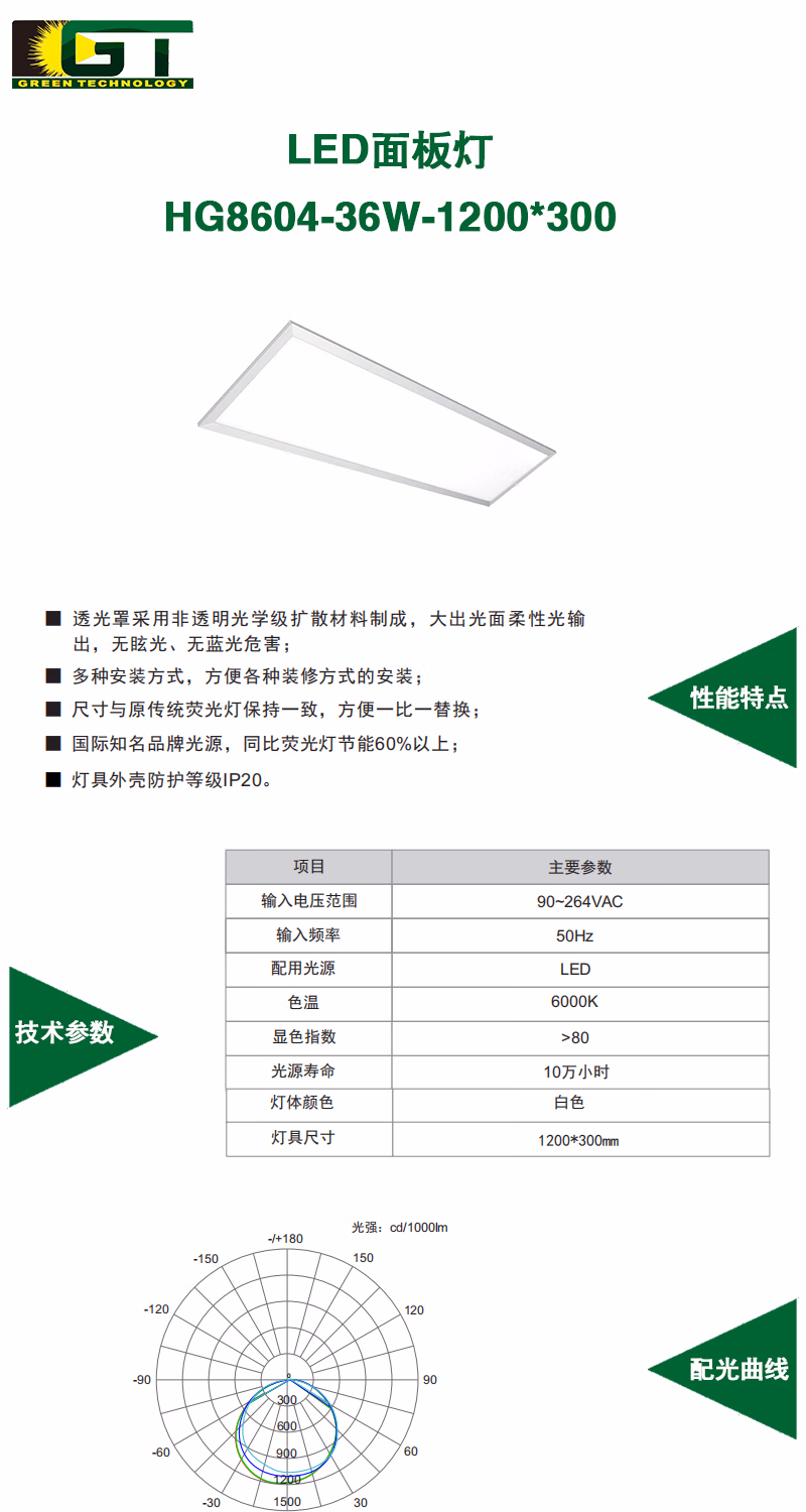 吉特(GT) HG8604-36W-1200*300 36W IP20 电压90~264VAC LED 色温6000K LED面板灯 (计价单位:台) 白色