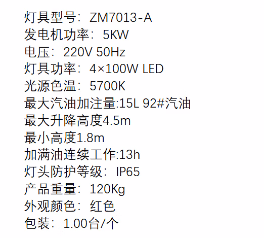 晫安联 ZM7013-A 4×100W IP65 220V 5KW发电机 ≥13h 5700K LED 自动升降工作灯 1.00 台/个 (计价单位:个) 红色