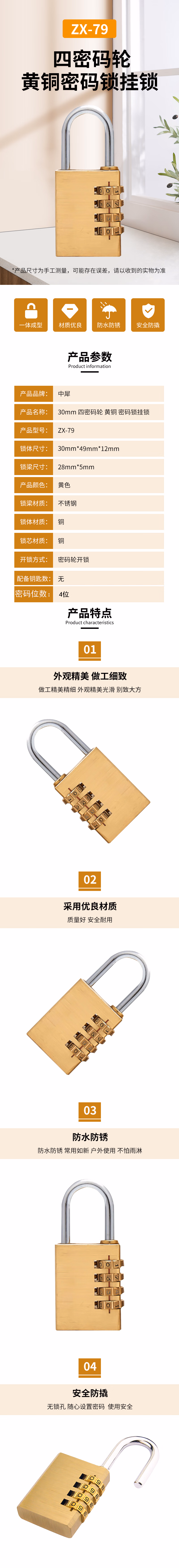 中犀 ZX-79 30mm 四密码轮 黄铜 密码锁 (计价单位:个) 黄色