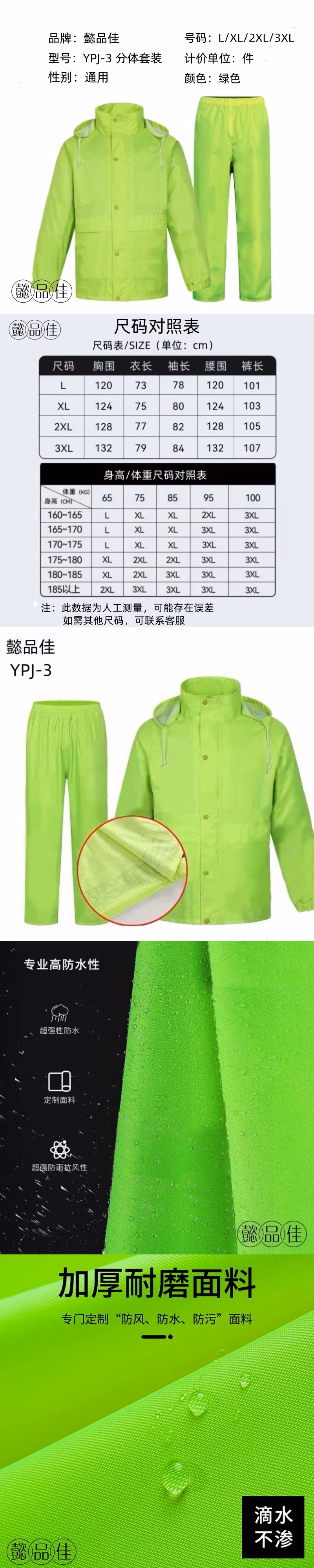 懿品佳 YPJ-3分体套装 雨衣 1.00 件/套 (计价单位:套) 绿色
