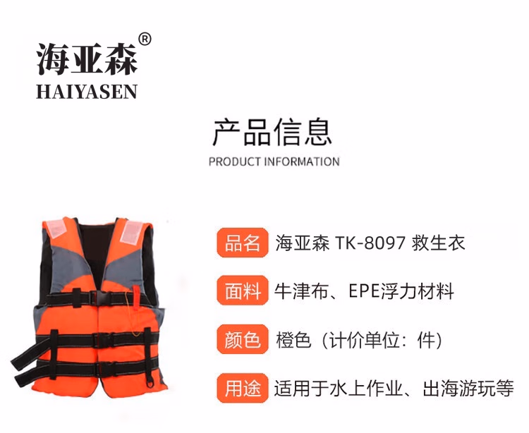 海亚森 TK-8097 通用均码 救生衣 1.00 套/件 (计价单位:件) 橙色