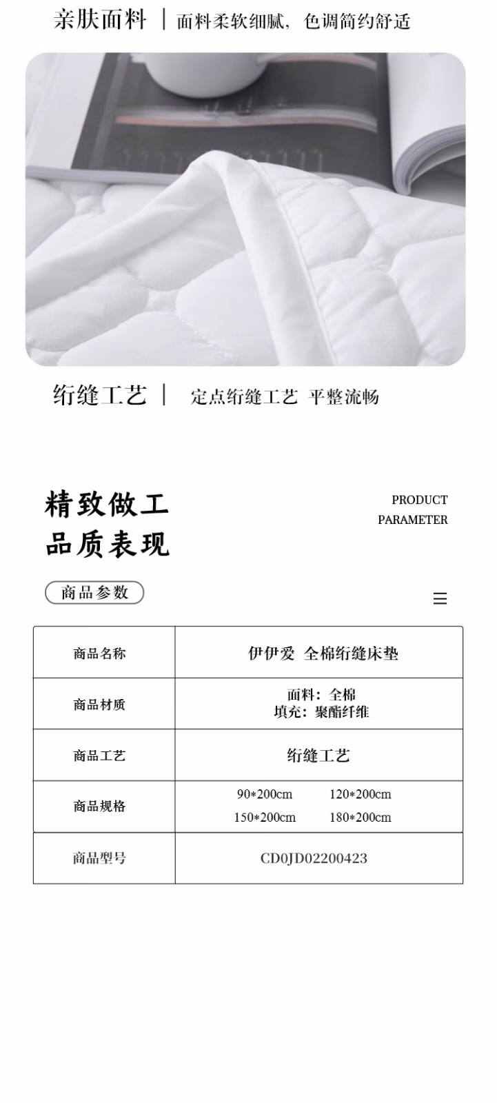 伊伊爱 CD0JD02200423 120*200cm 全棉绗缝床垫1.5cm厚 垫子褥子 1.00 件/张 (计价单位:张) 白色