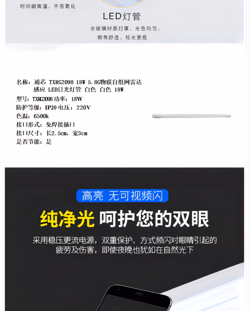 通芯 TXRG2098 1.2m 18W IP20 220V 6500K 5.8G物联自组网雷达感应 LED日光灯管 (计价单位:个) 白色