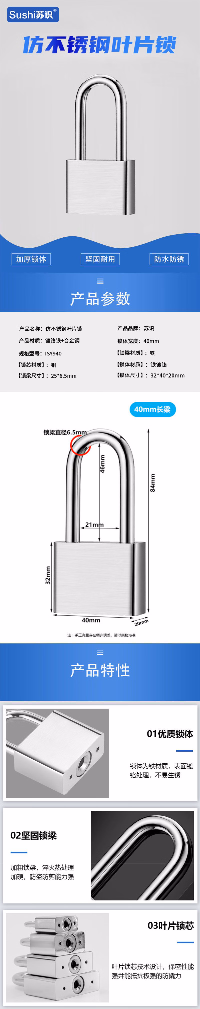 • 商品名称:苏识 ISY940 40mm 长粱仿不锈钢 叶片锁挂锁 (计价单位:个) 银色