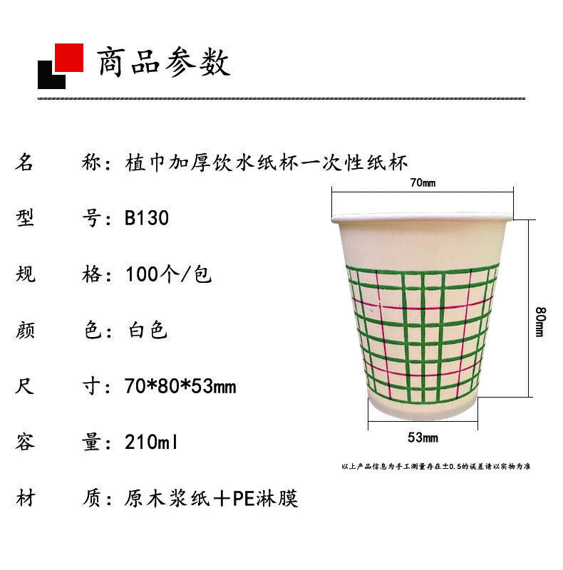 植巾 B130 210ml 加厚饮水纸杯 一次性纸杯 100.00 个/包 (计价单位:包) 白色
