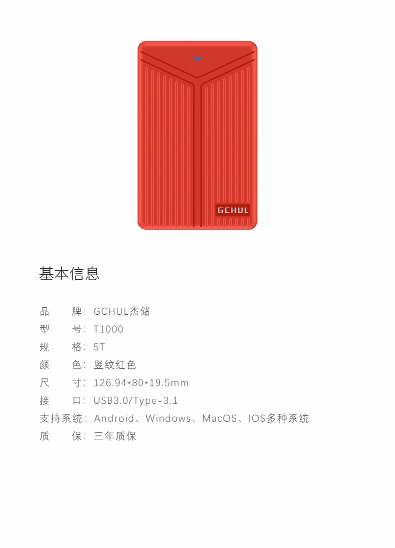 杰储(GCHUL) T1000 5T Type-C3.1 2.5英寸竖纹红色 移动硬盘 (计价单位:个) 竖纹红色