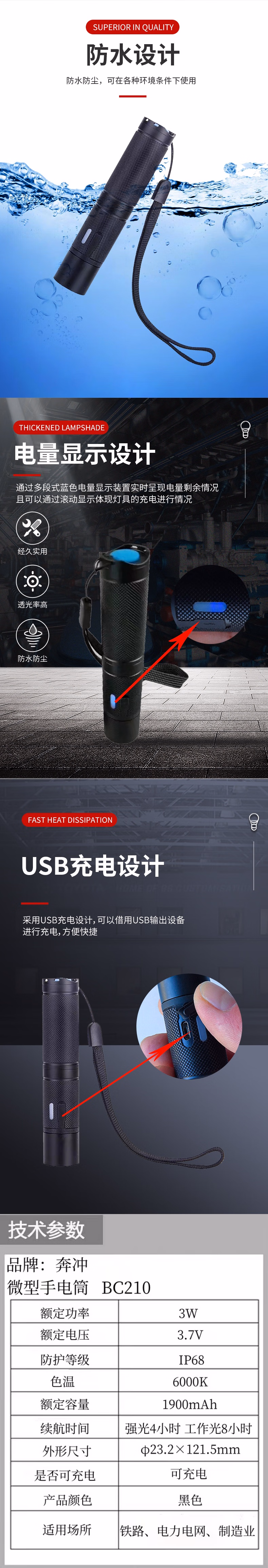 奔冲 BC210 额定功率3W 额定电压3.7V 防护等级IP68 额定容量1900mAh 微型手电筒 电筒 (计价单位:个) 黑色