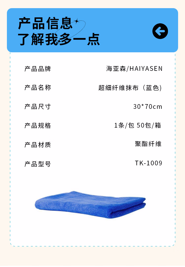 海亚森 TK-1009 84g 30*70cm 超细纤维抹布 (计价单位:块) 蓝色