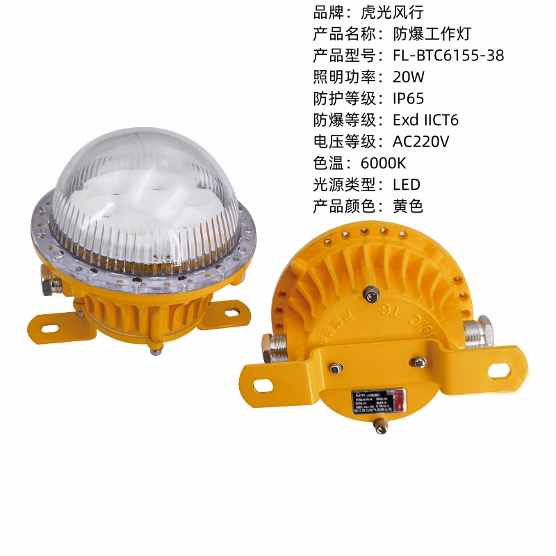 虎光风行 FL-BTC6155-38 照明功率20W 防护等级IP65 防爆等级Exd IICT6 电压等级AC220V 光源颜色/色温6000K 光源类型LED 防爆工作灯 1.00 盏/台 (计价单位:台) 黄色