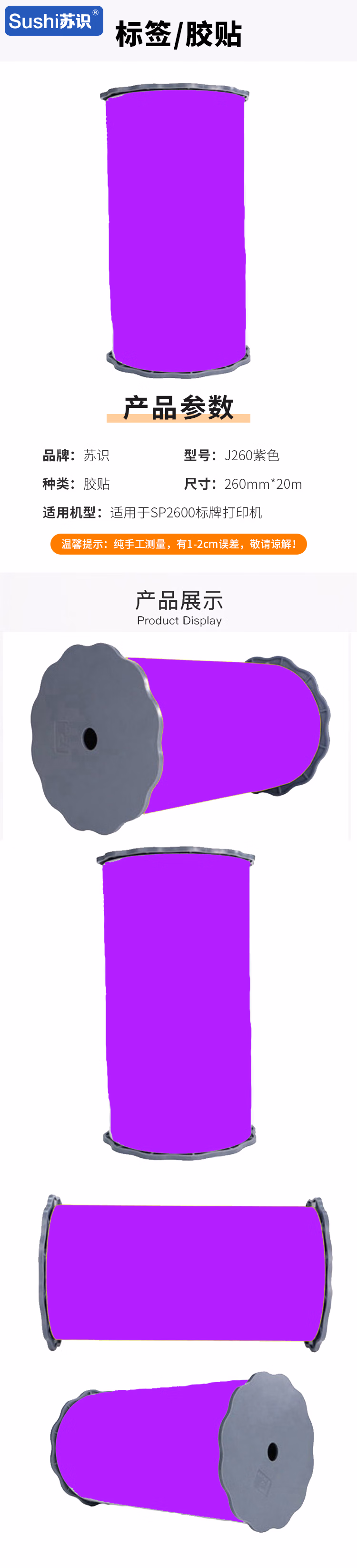 • 商品名称:苏识 J260紫色 260mm*20m 适用SP2600标牌打印机 胶贴 (计价单位:盒) 紫色