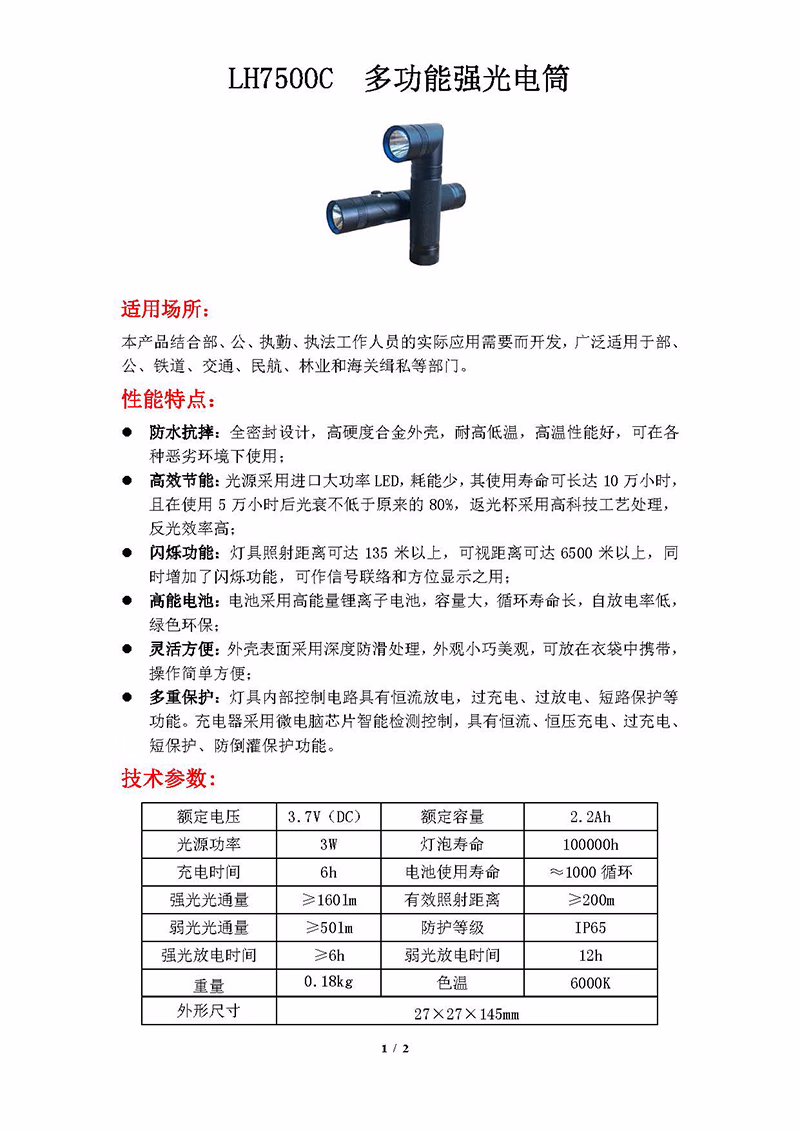 • 商品名称:LH7500C 多功能强光电筒 3W DC3.7V 冷光 IP65 12h(计价单位:个)黑色 黑色