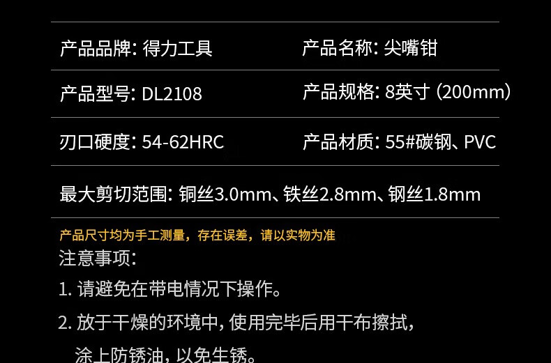 得力(deli)尖嘴钳子省力型电工钳子多功能防滑手柄尖头钳尖口钳尖咀钳针嘴钳 6寸/160mm/DL2106 单位:把