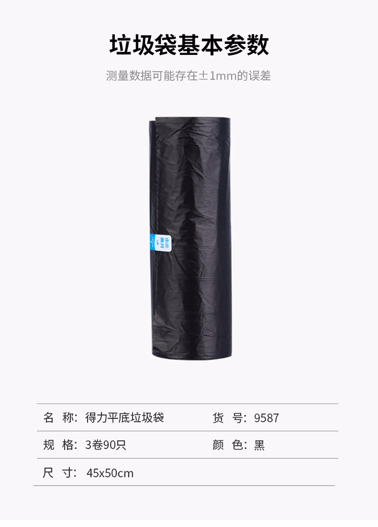 得力9587平底垃圾袋(黑)(3卷/包)450*500*0.007mm平底