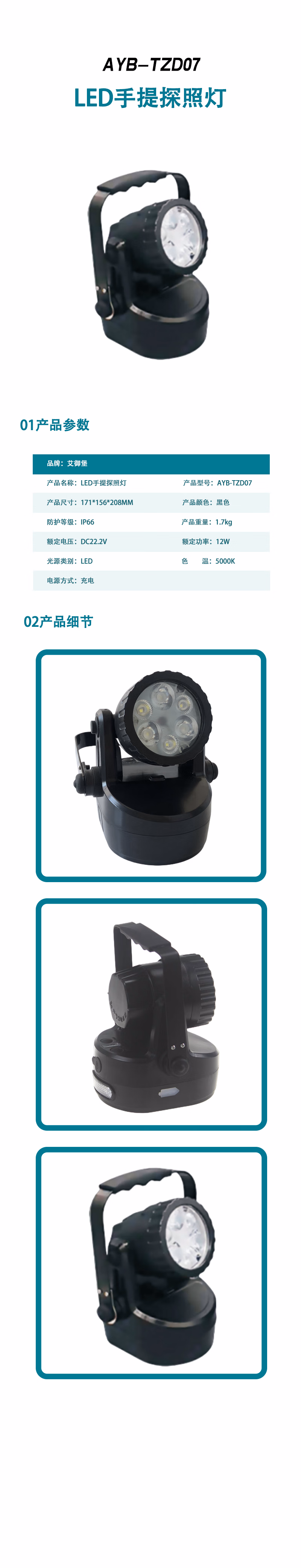 艾御堡 AYB-TZD07 DC22.2V 5000K 正白 LED 探照灯 (计价单位:盏) 黑色