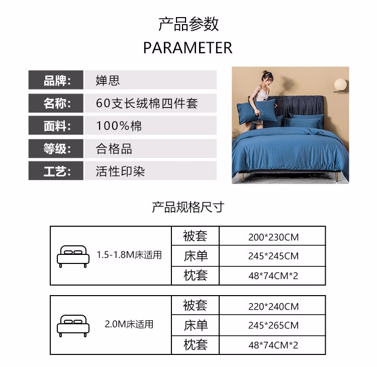 婵思 TJ0WL02100634 200*230cm 床上四件套 (计价单位:套) 纯色-月光蓝