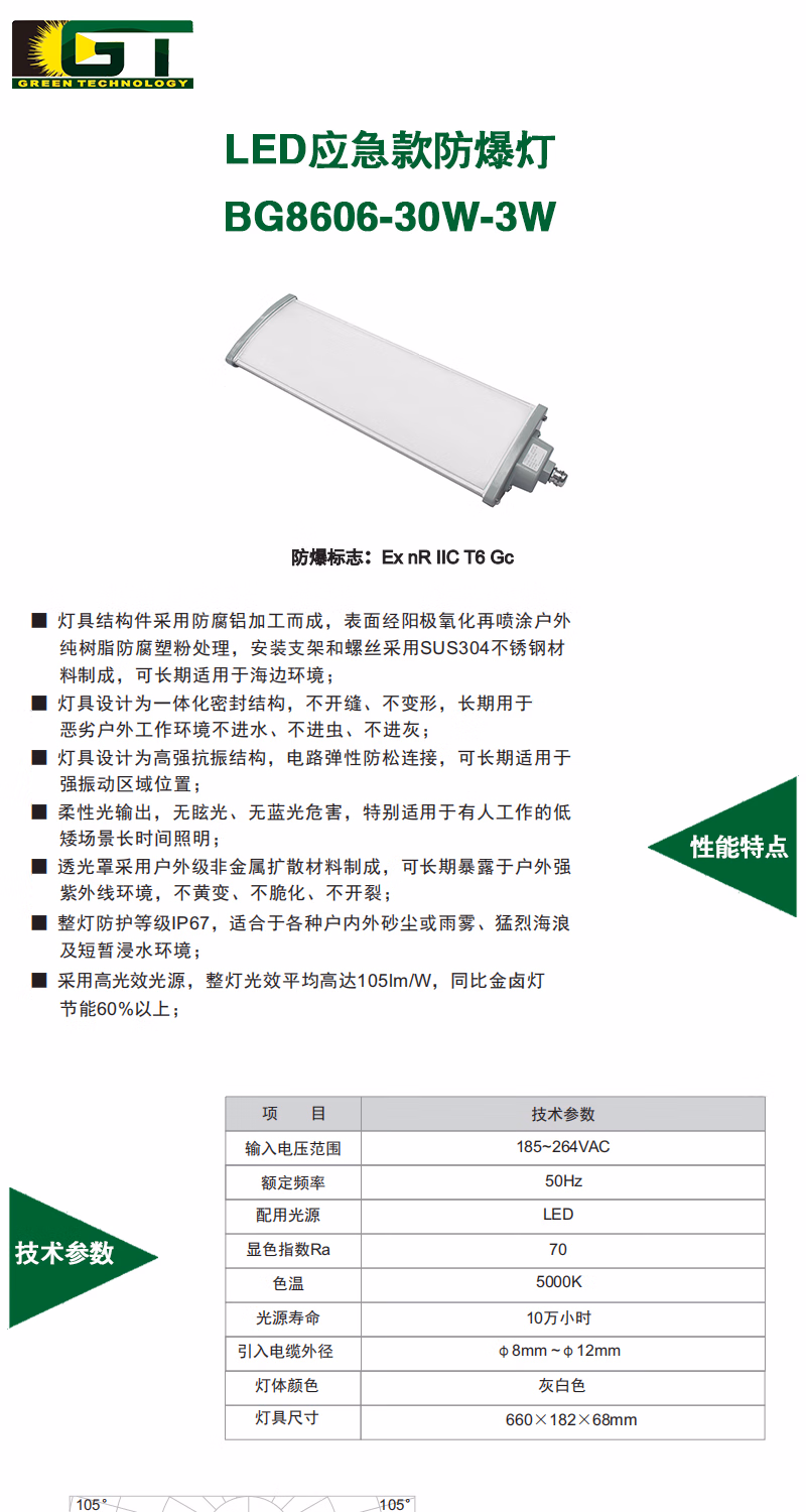 吉特(GT) BG8606-30W-3W 30W-3W IP67 Ex nR IIC T6 Gc 电压AC185~264V LED 色温5000K 灰白色 LED应急款防爆灯 1.00 盏/个 (计价单位:个) 灰白色