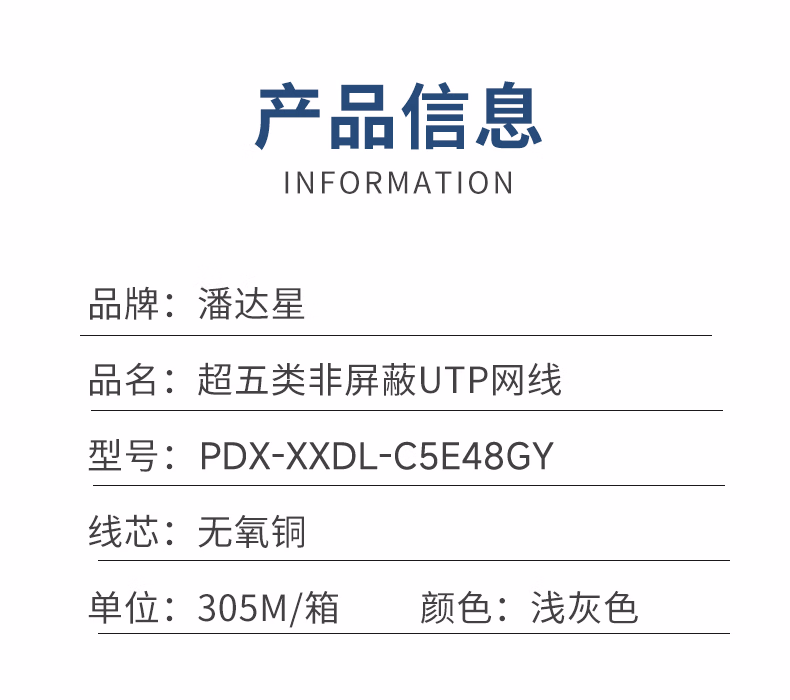 潘达星 PDX-XXDL-C5E48GY 305m/箱 超五类非屏蔽UTP 305.00 米/箱 (计价单位:箱) 浅灰色