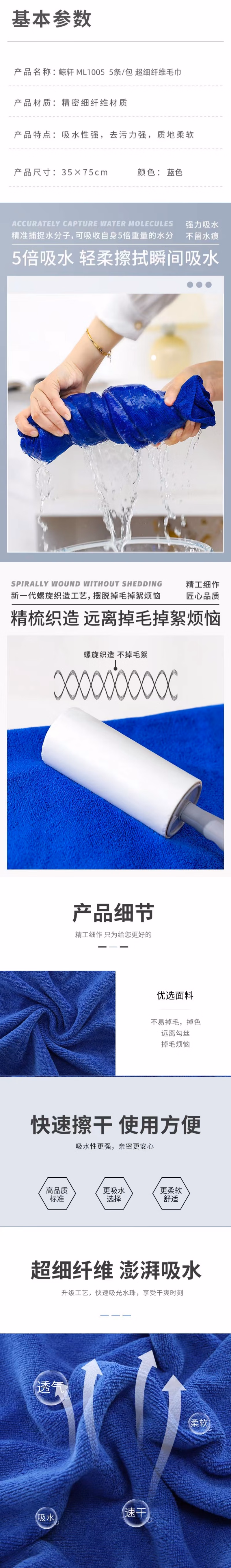鲸轩 ML1005 35*75cm 超细纤维 毛巾 5.00 条/包 (计价单位:包) 蓝色