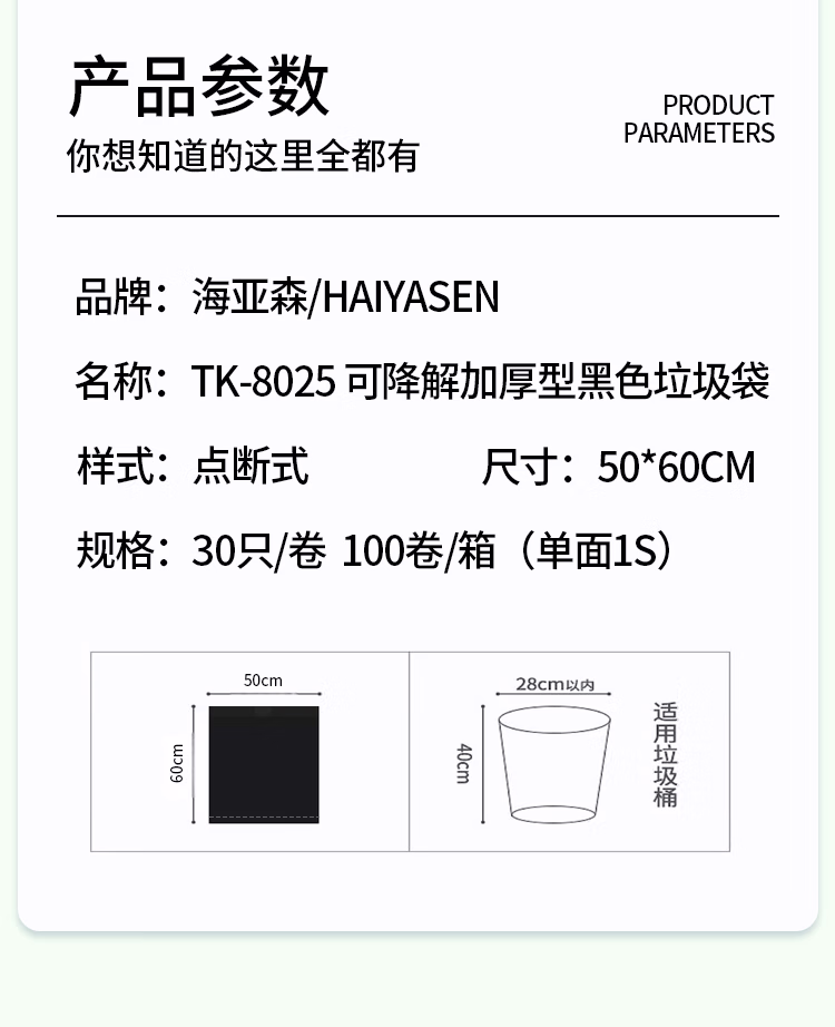 海亚森 TK-8025 50cm*60cm 可降解加厚型 30只/卷 垃圾袋 1.00 包/卷 (计价单位:卷) 黑色 2卷起订