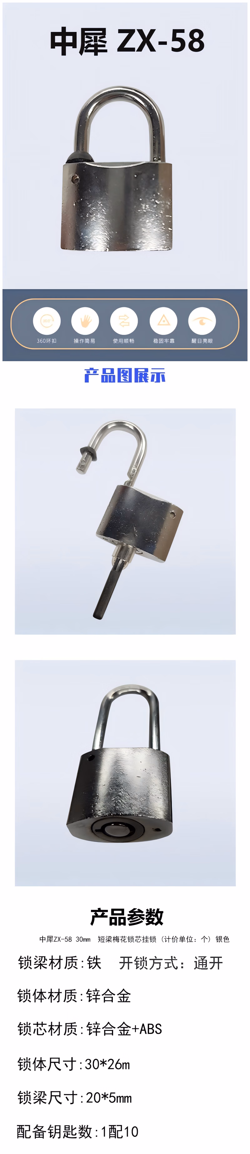 中犀 ZX-58 30mm 短梁梅花锁芯 挂锁 (计价单位:个) 银色