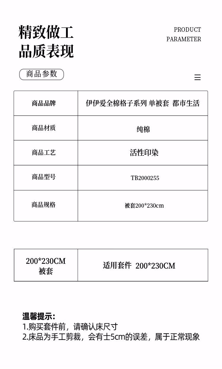 伊伊爱 TB2000255 200*230cm 都市生活 新品全棉格子系列 单被套 1.00 件/条 (计价单位:条) 都市生活