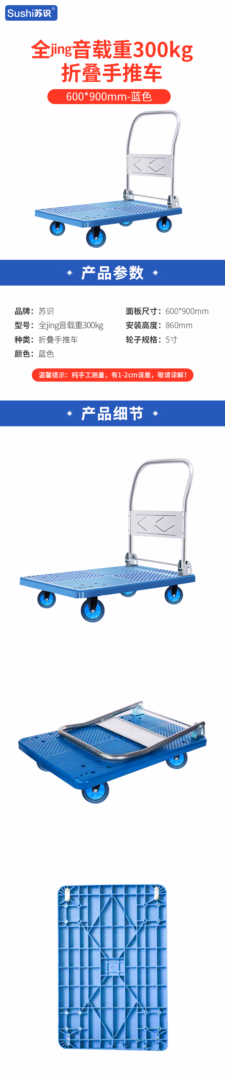 • 商品名称:苏识 600*900mm-蓝色 全jing音载重300kg 折叠手推车 1.00 辆/个