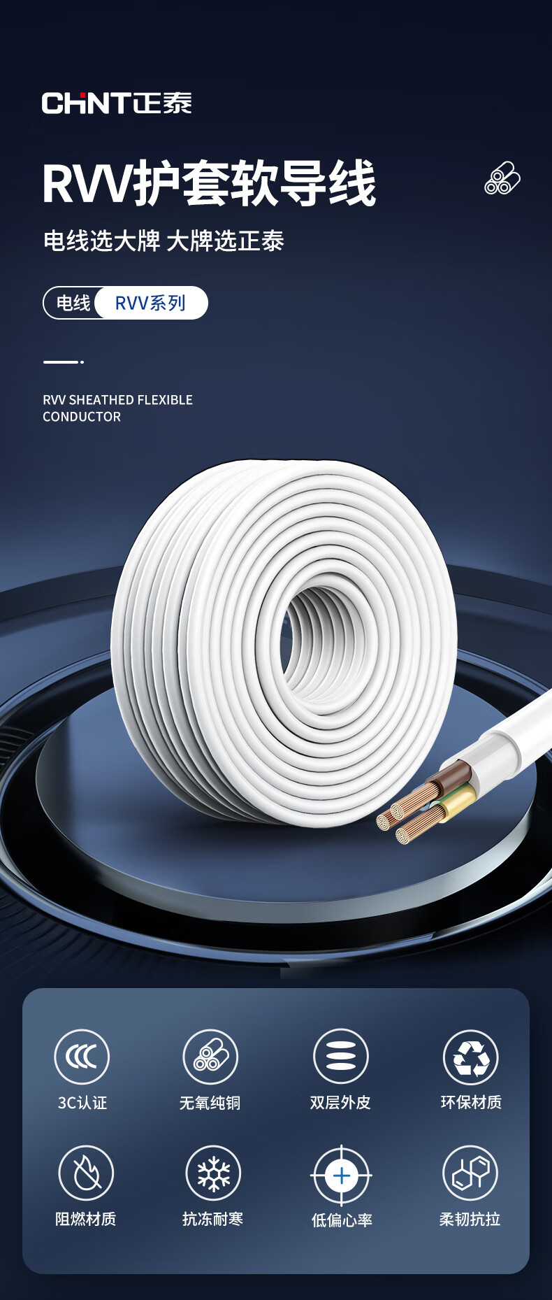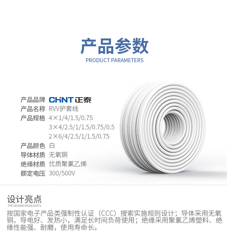 正泰(CHNT) 护套线 国标平行线RVV2*4平方等软线两芯铜芯电线电缆1.5平方 RVV2*2.5(100米) 单位:卷