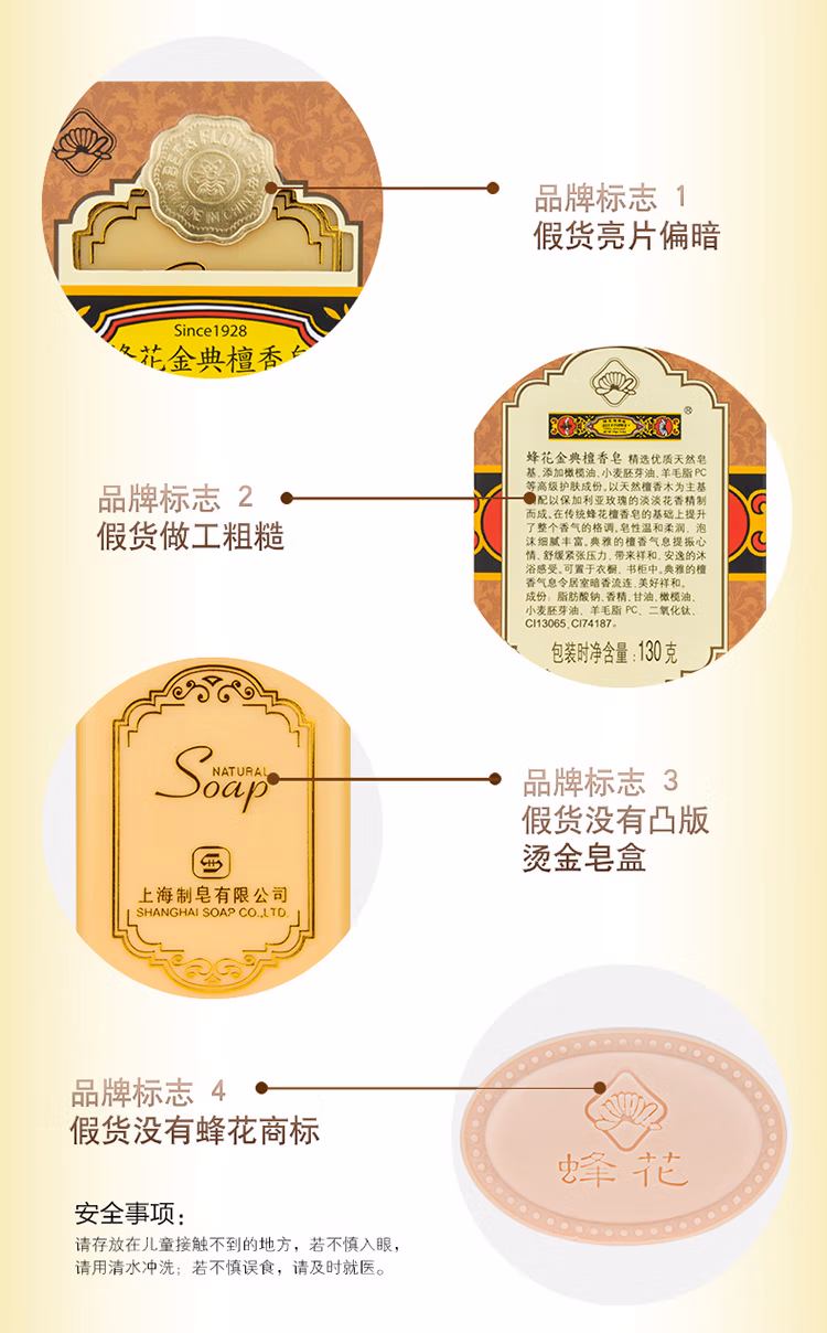 品牌: 蜂花 产品规格: 130g 保质期: 3年 产品成分:脂肪酸钠、香精、甘油、橄榄油、小麦胚芽油、羊毛脂PC、二氧化钛等 产地: 中国