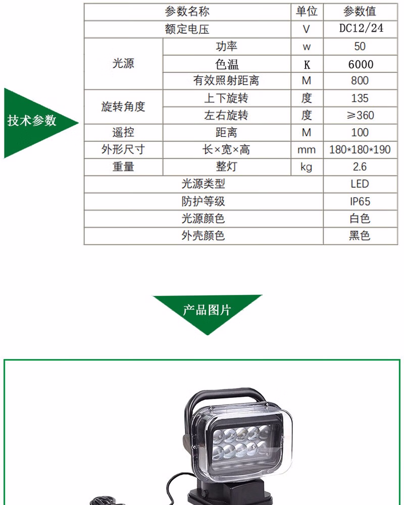 吉特(GT) TMN5512 功率50W 防护等级IP65 电压DC12/24V 6000K 光源LED 车载遥控探照灯 (计价单位:盏) 黑色