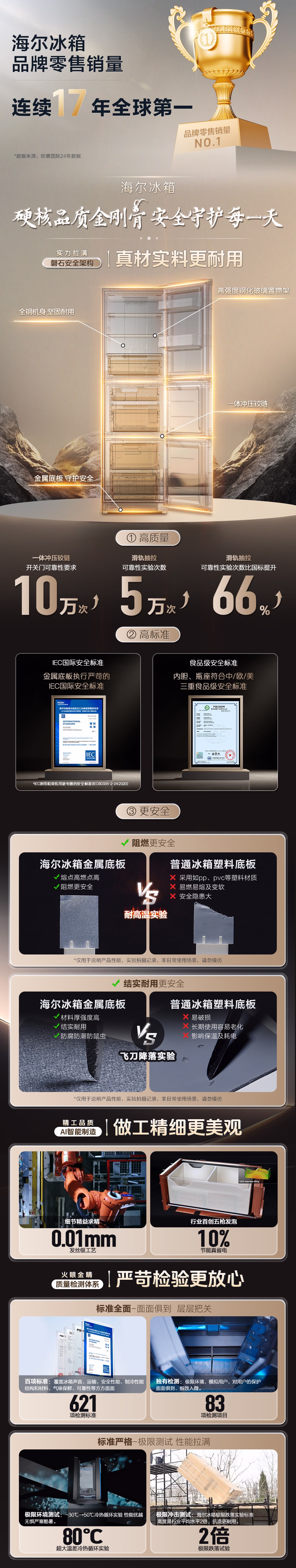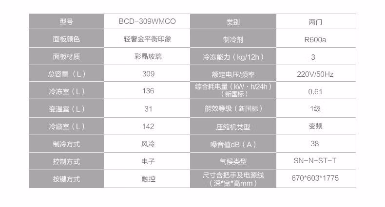 海尔(Haier) BCD-309WMCO 309升 风冷无霜一级变频 三档变温 两门 电冰箱 (计价单位:台) 金色