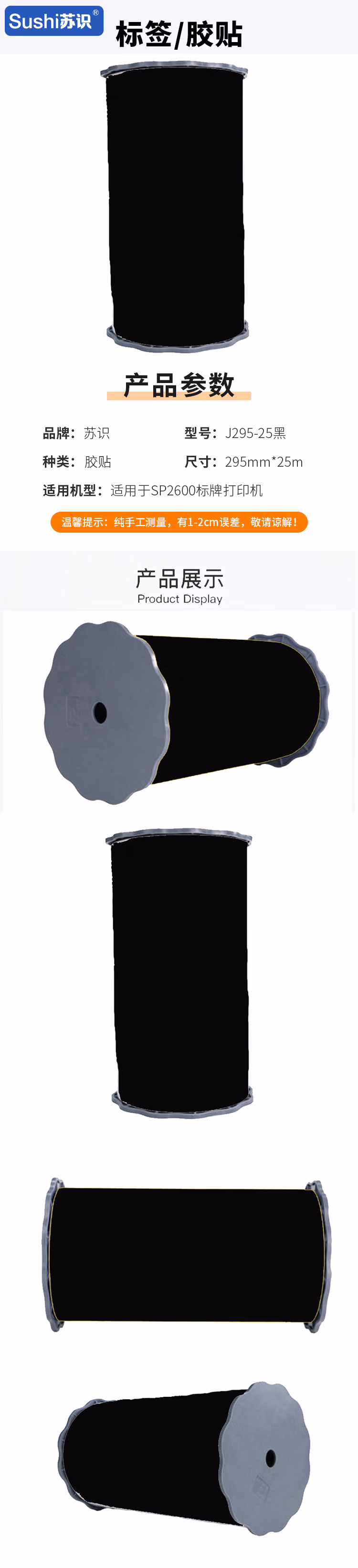 • 商品名称:苏识 J295-25黑 295mm*25m 适用SP2600标牌打印机 胶贴 (计价单位:盒) 黑色