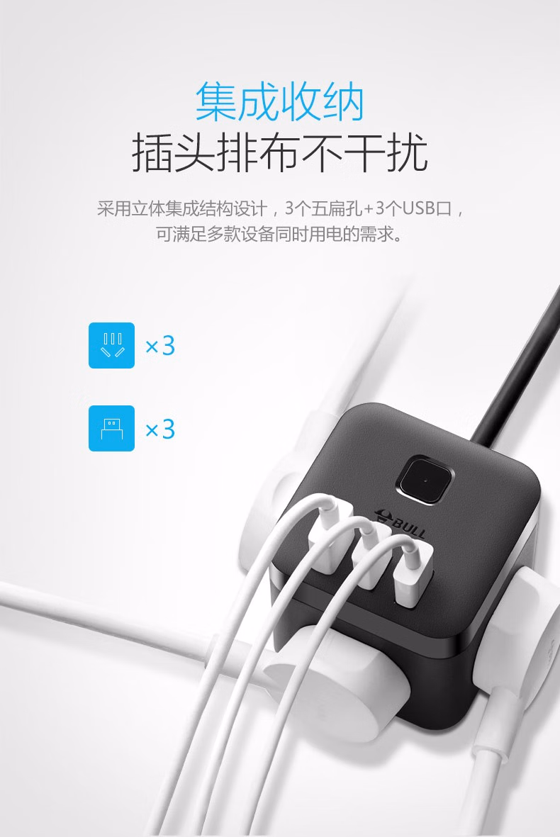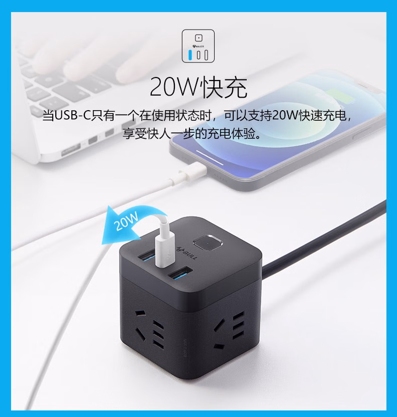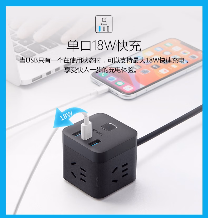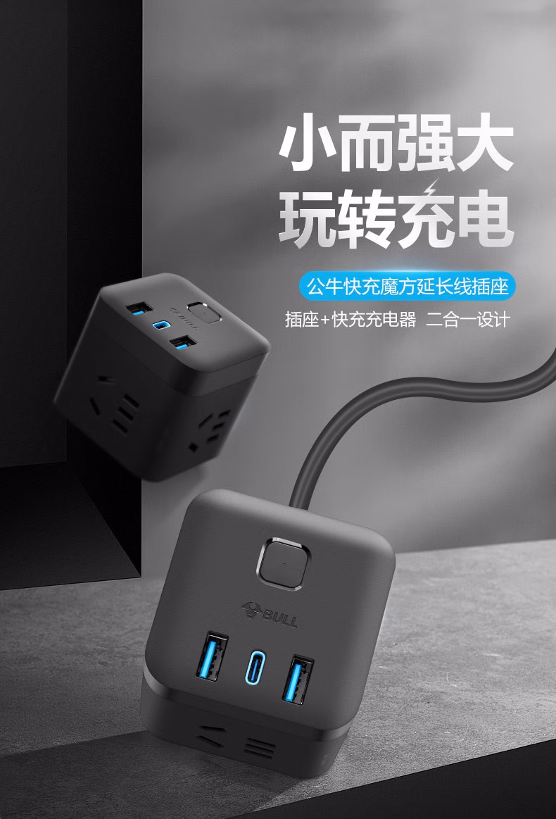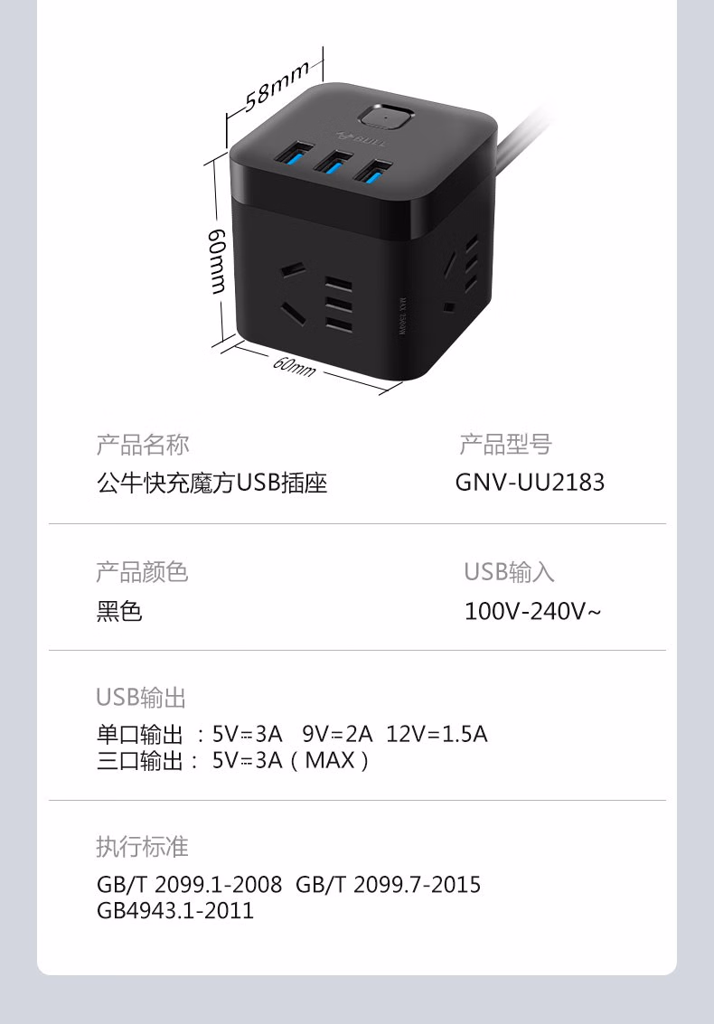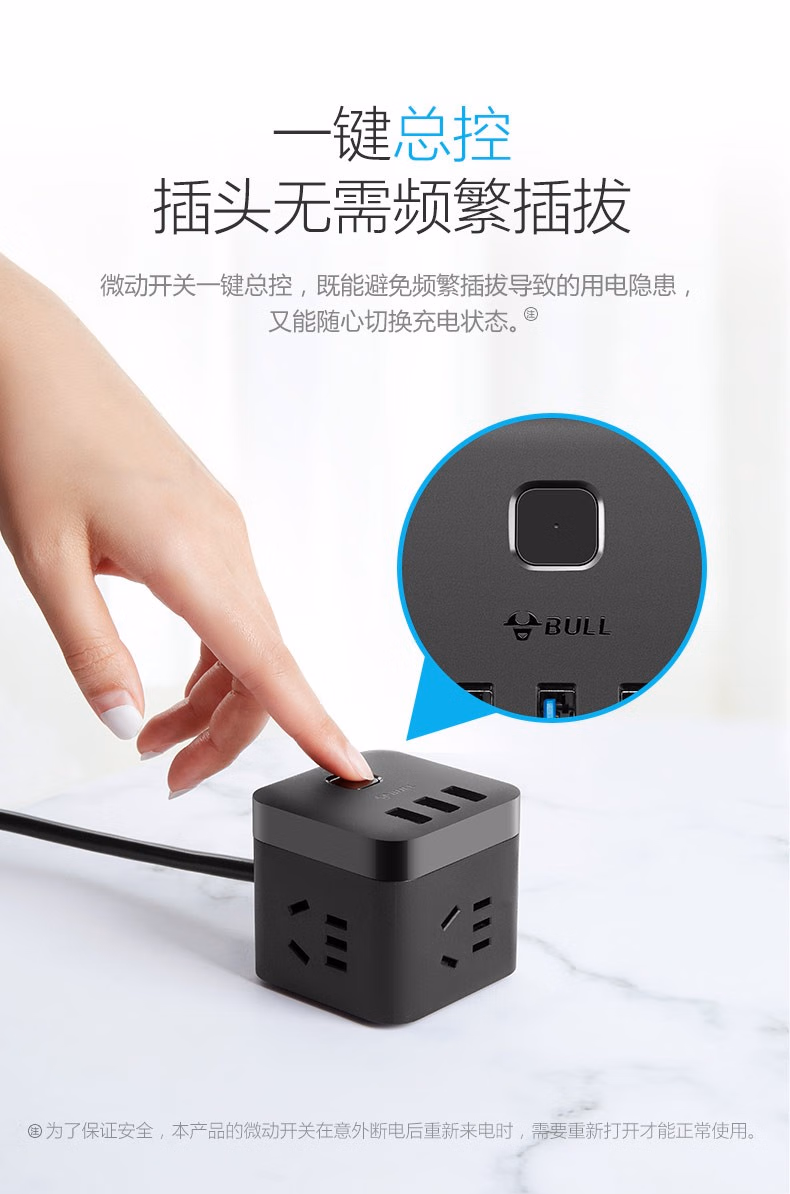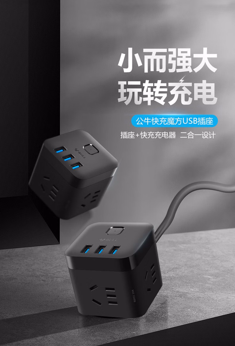 公牛(BULL) GNV-UU2203H 20W快充魔方插座 总控1.5米 插排 (计价单位:个) 黑色