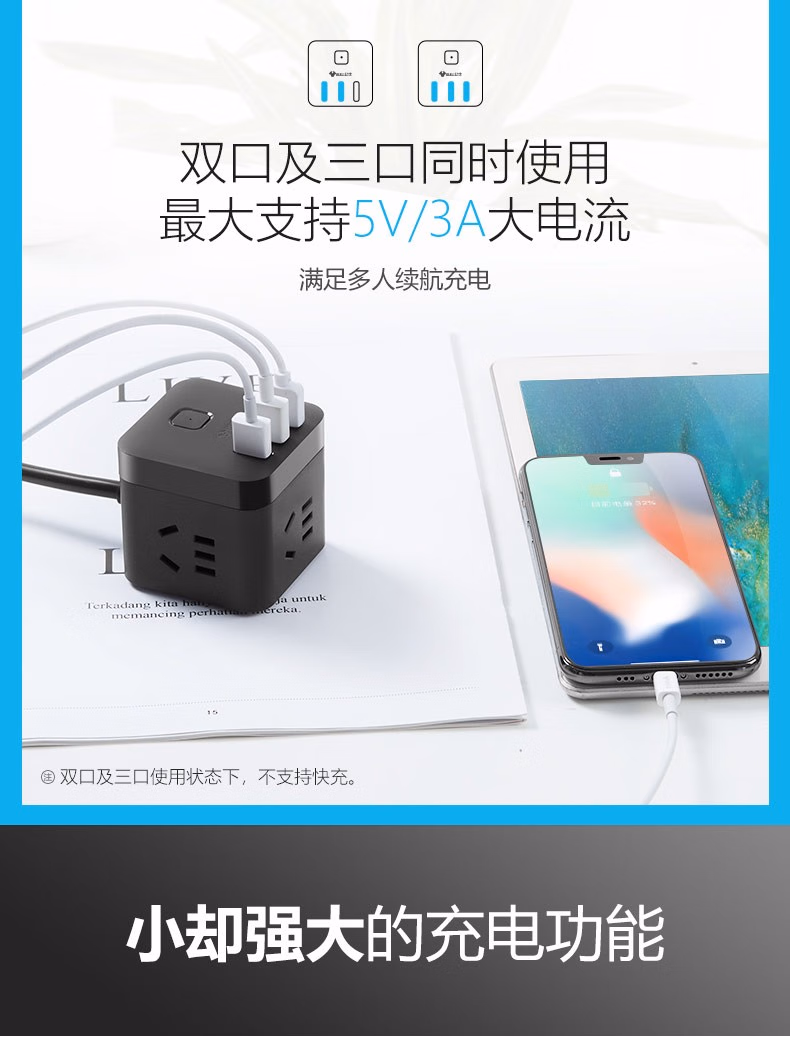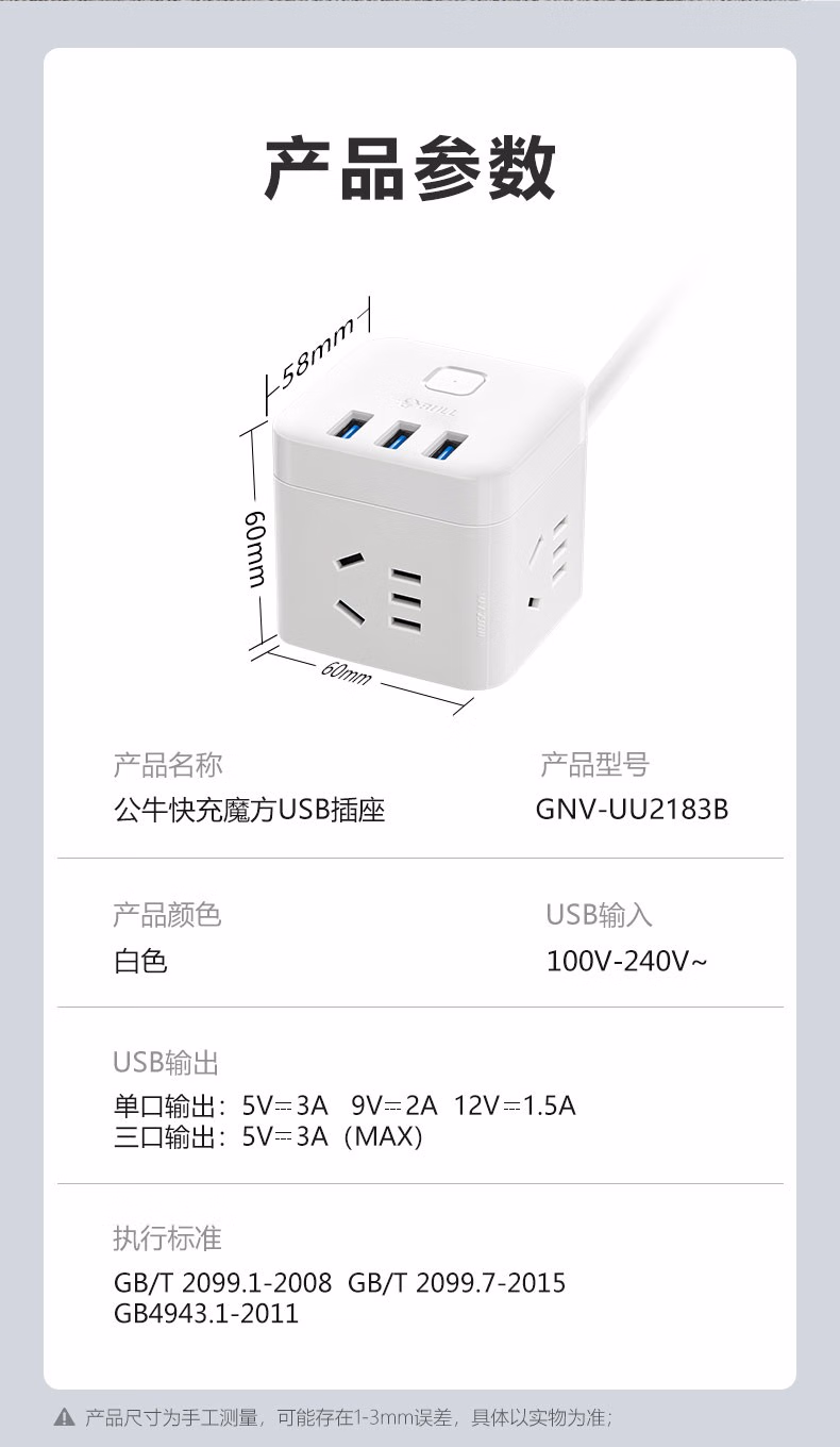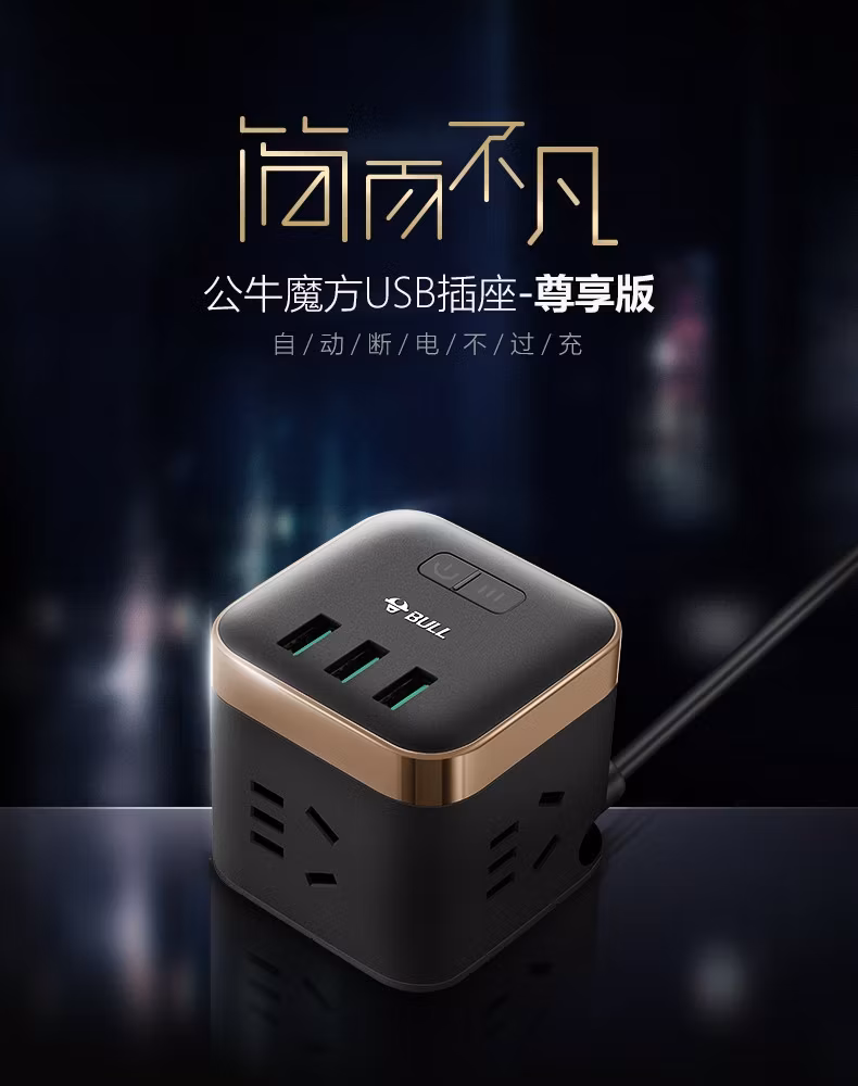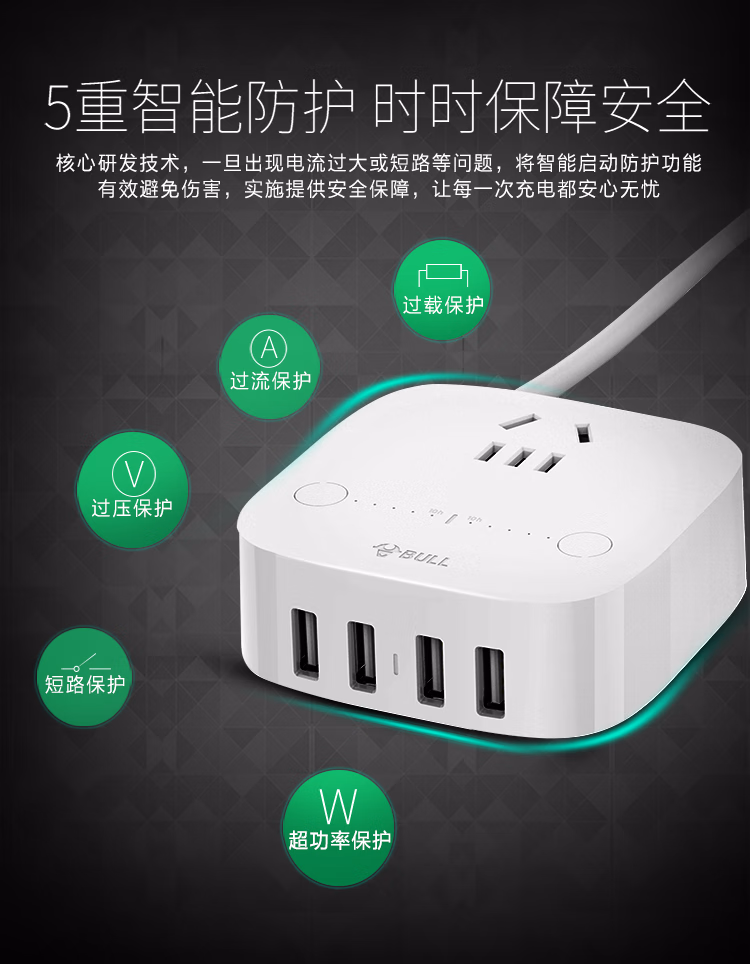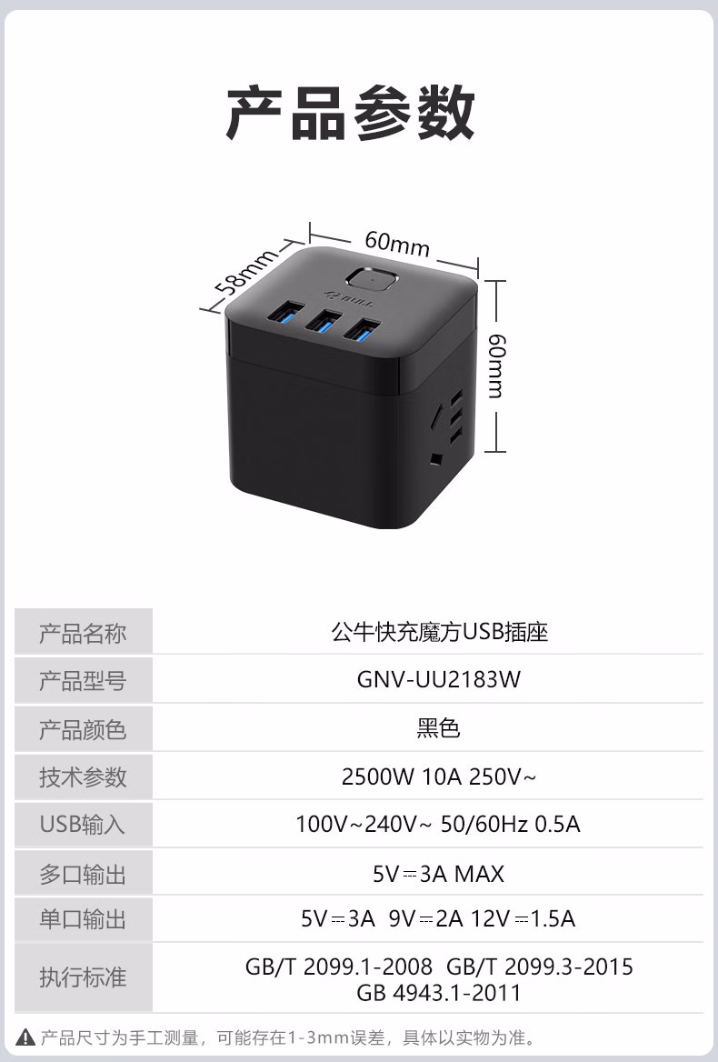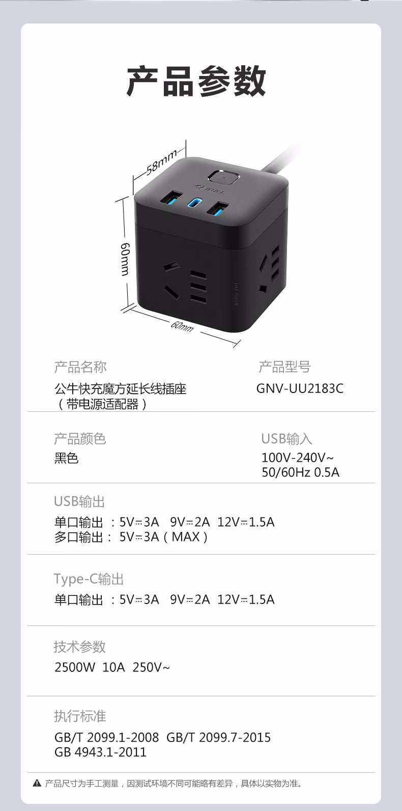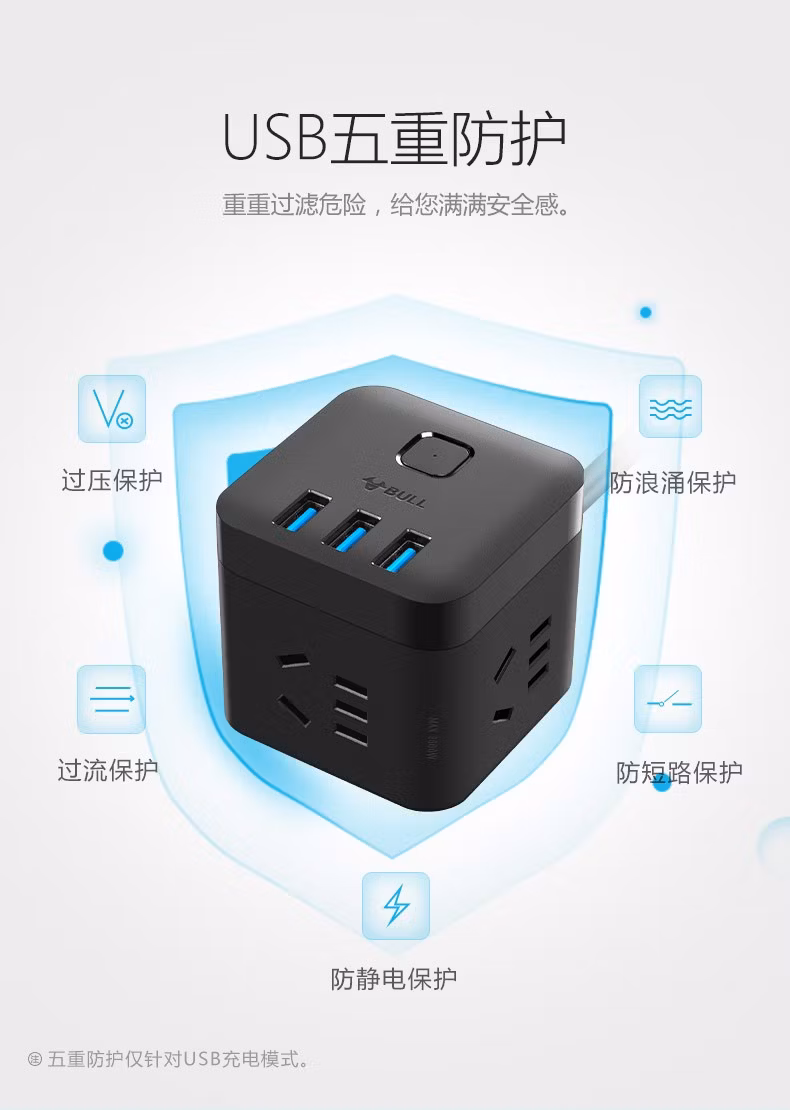 公牛(BULL) GNV-UU2203H 20W快充魔方插座 总控1.5米 插排 (计价单位:个) 黑色