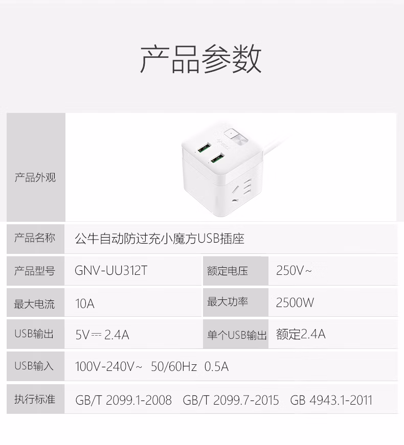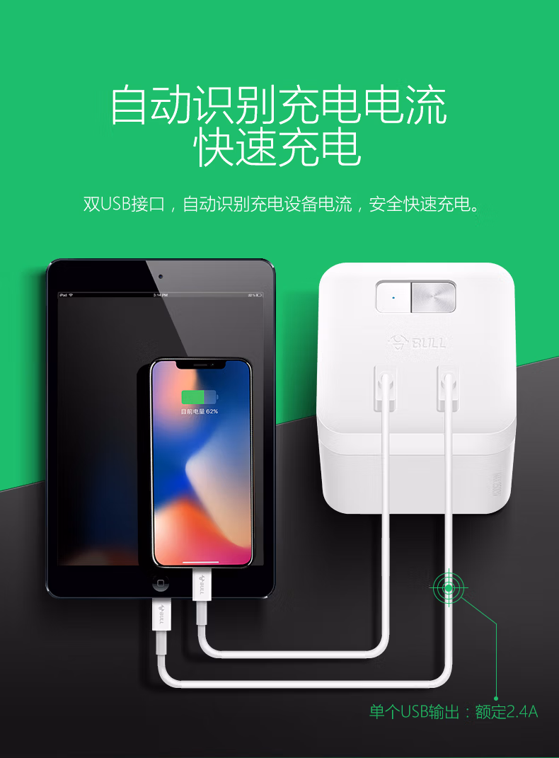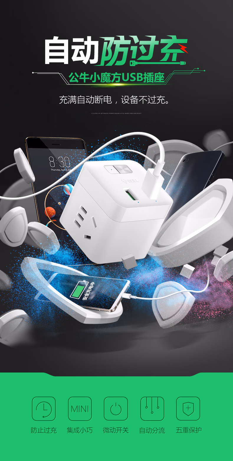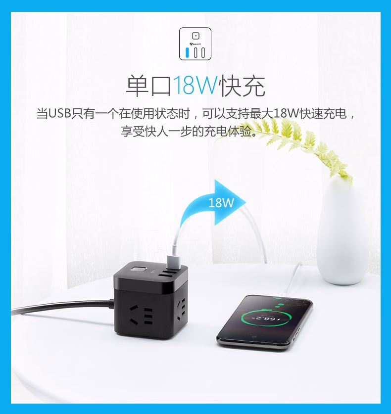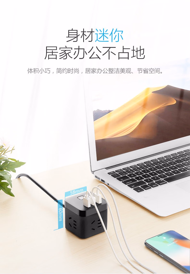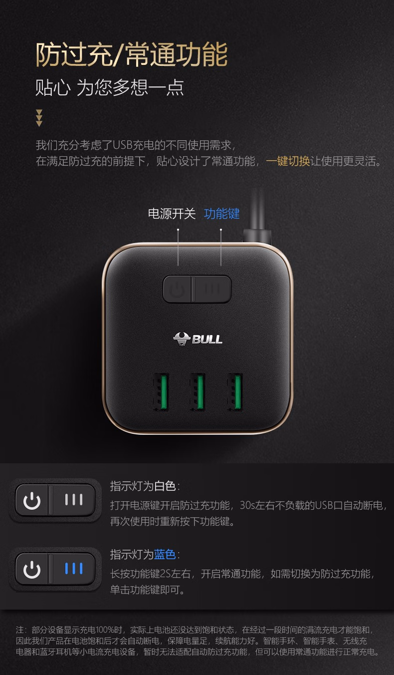 公牛(BULL) GNV-UU2203H 20W快充魔方插座 总控1.5米 插排 (计价单位:个) 黑色