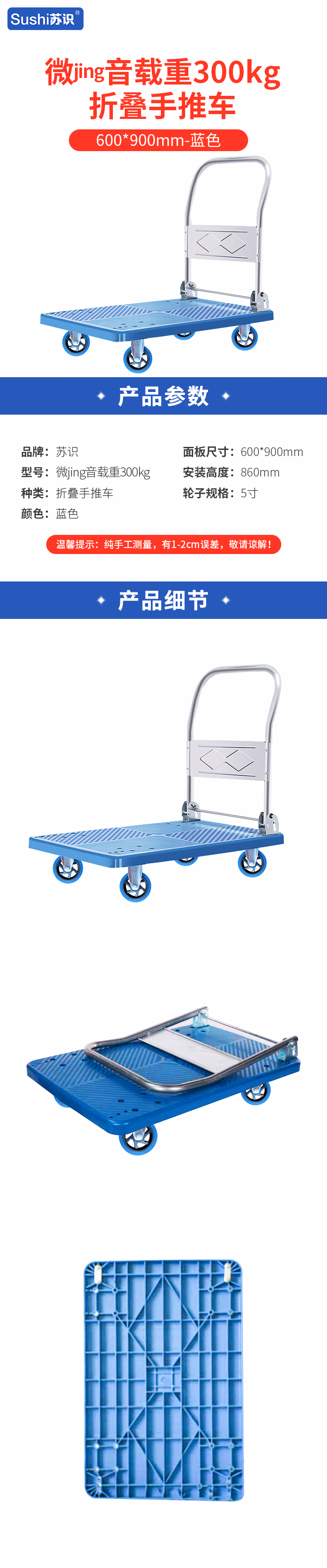 • 商品名称:苏识600*900mm-蓝色微jing音载重300kg 折叠手推车 1.00 辆/个