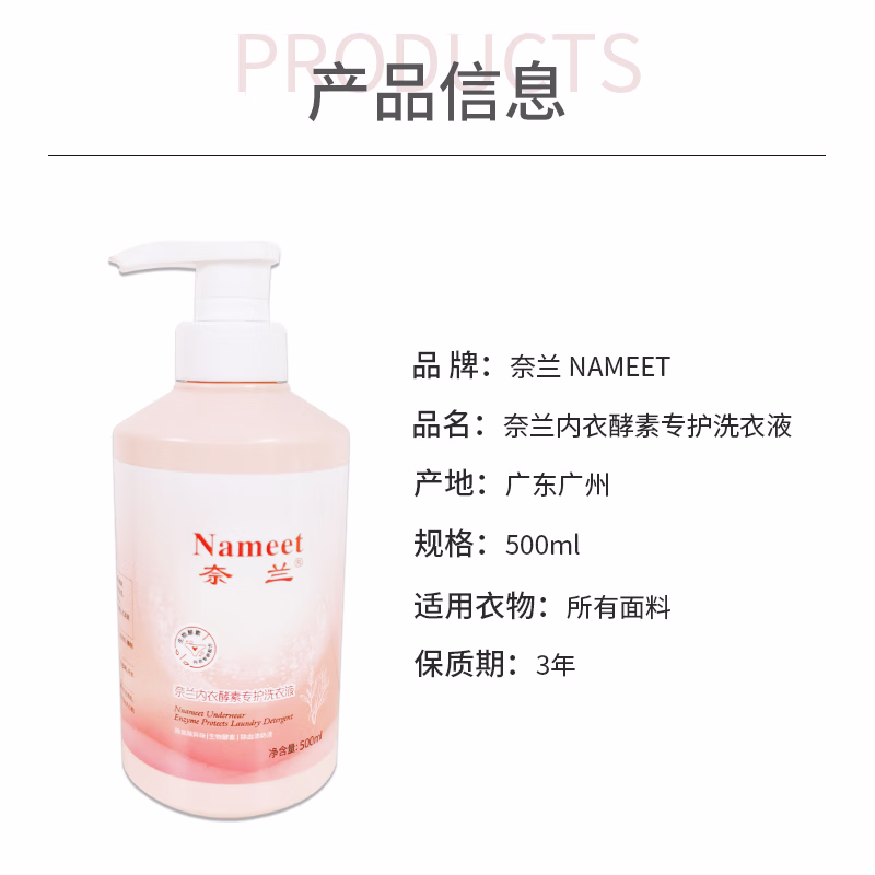 奈兰(NAMEET) 500ml 粉色 内衣酵素专护洗衣液 (计价单位:瓶)