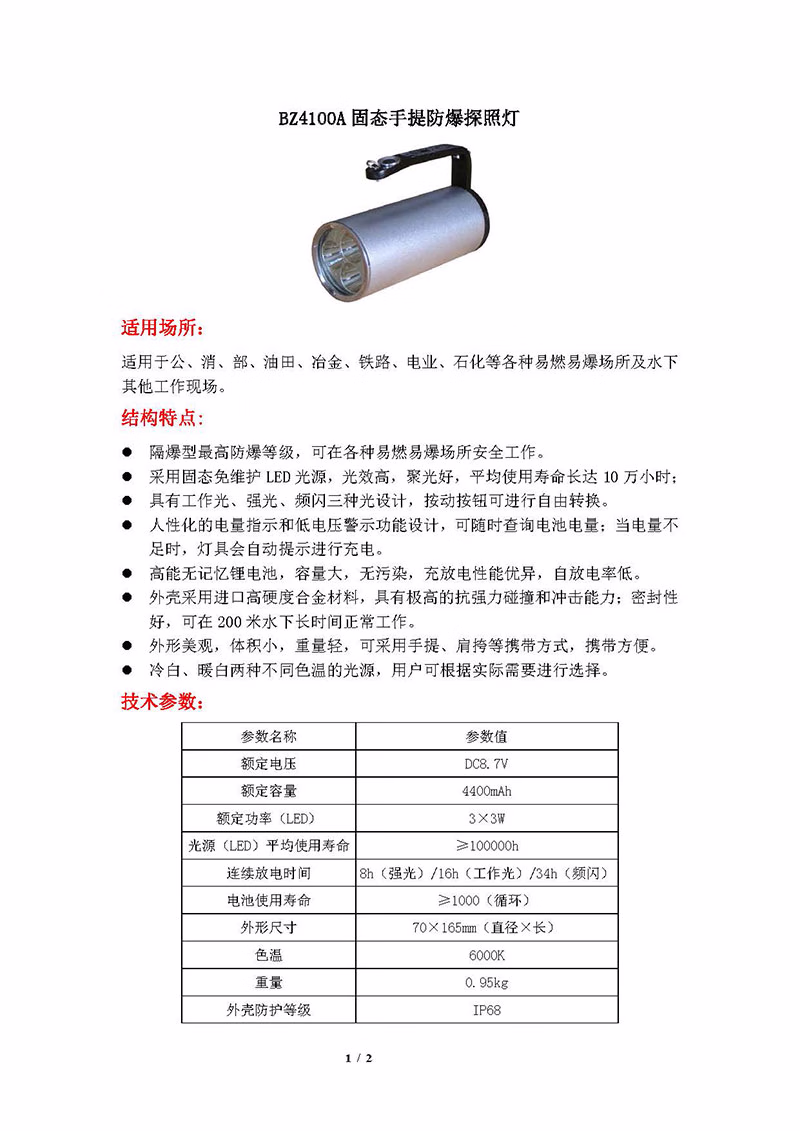 • 商品名称:BZ4100A 固态手提防爆探照灯 3×3W 8.7V 冷光 IP68 (计价单位:套) 银色