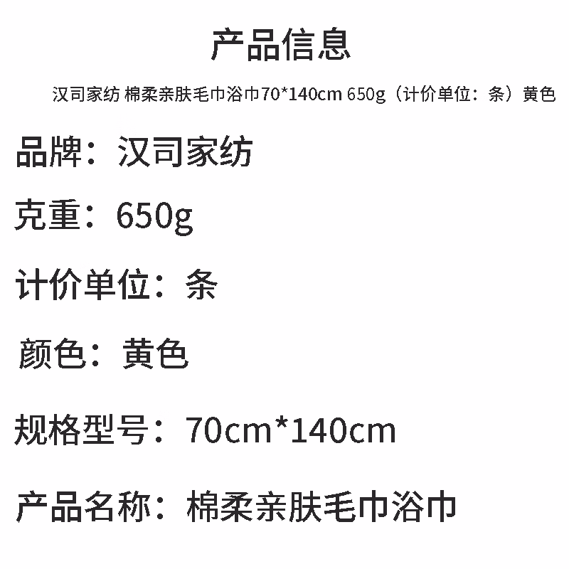 汉司家纺 棉柔亲肤 70*140cm 650g 毛巾 (计价单位:条) 黄色
