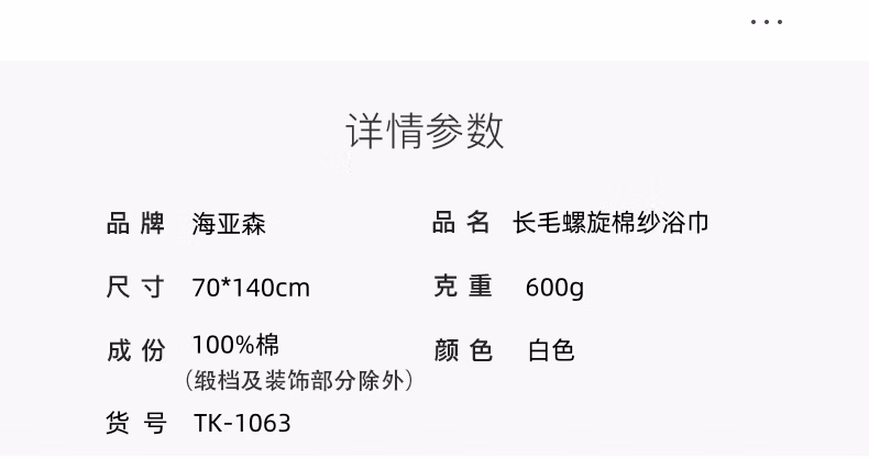 海亚森 TK-1063 70*140cm 600g 毛巾 (计价单位:条) 白色
