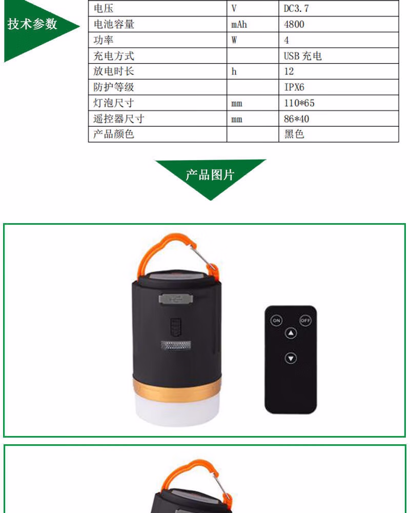 吉特(GT) TMN1141 4W IPX6 时长12h 电压3.7V 白光 LED 多功能帐篷灯 (计价单位:盏) 黑色