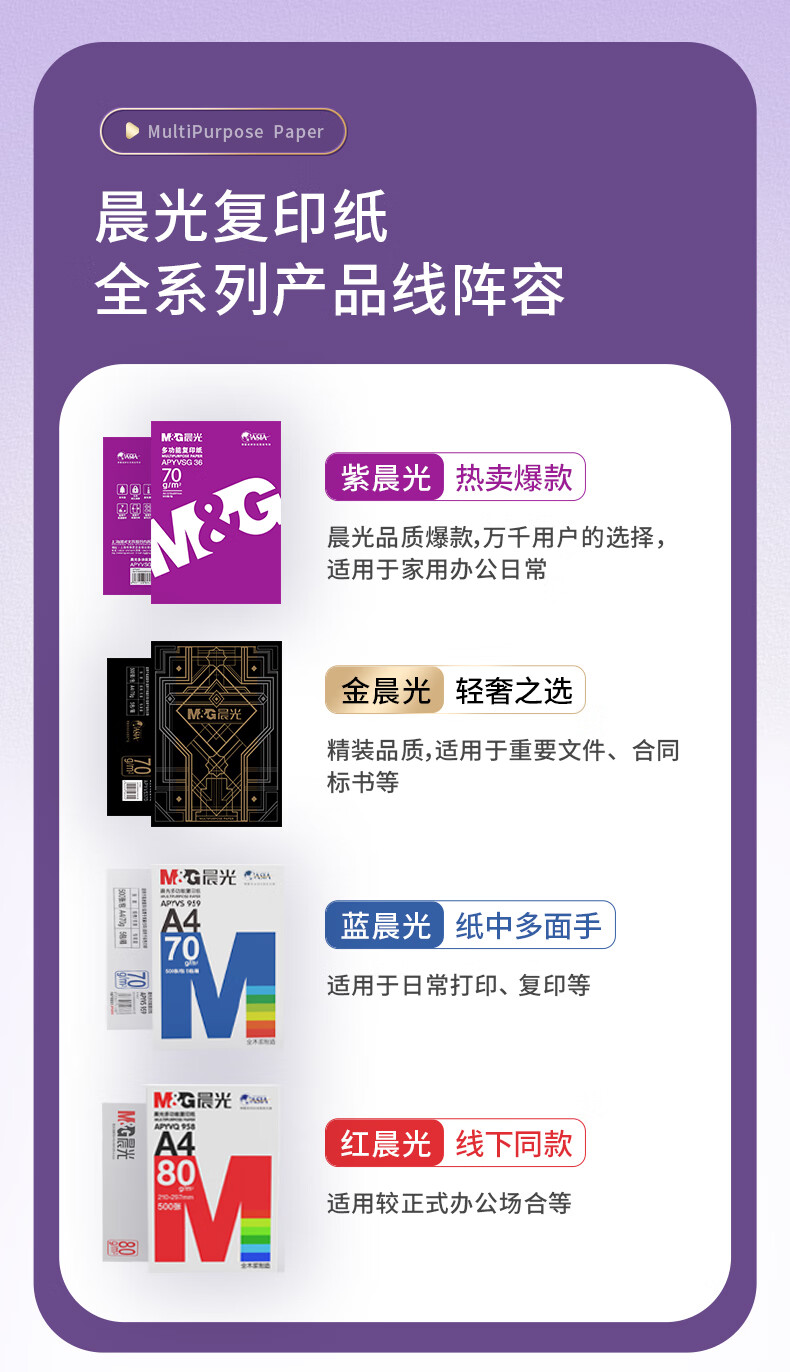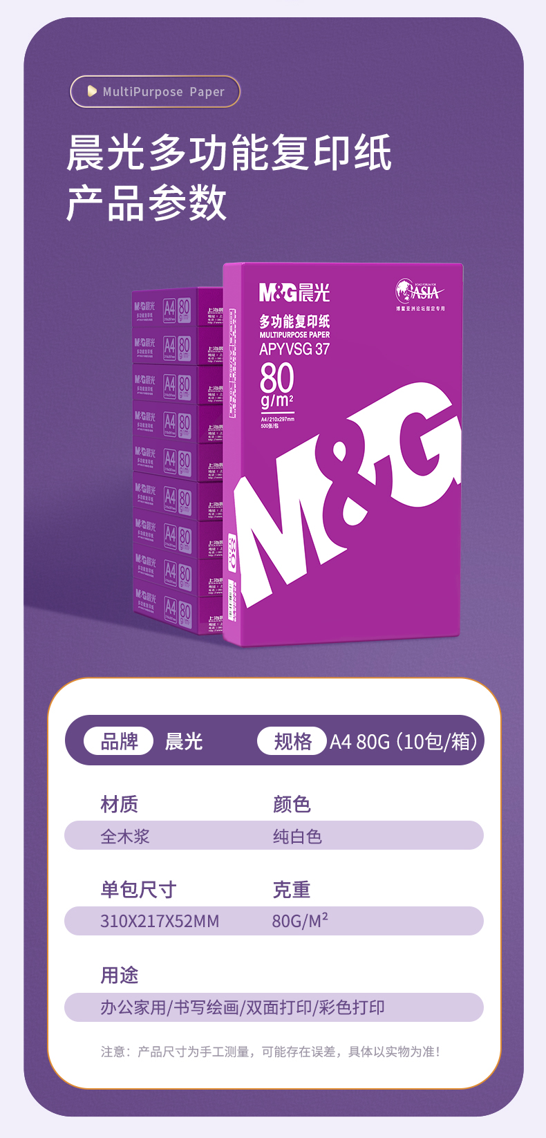 晨光(M&G)紫晨光 A4 80g 加厚双面打印纸 热销款复印纸 500张/包 10包1箱(整箱5000张) APYVQAS1 单位:箱