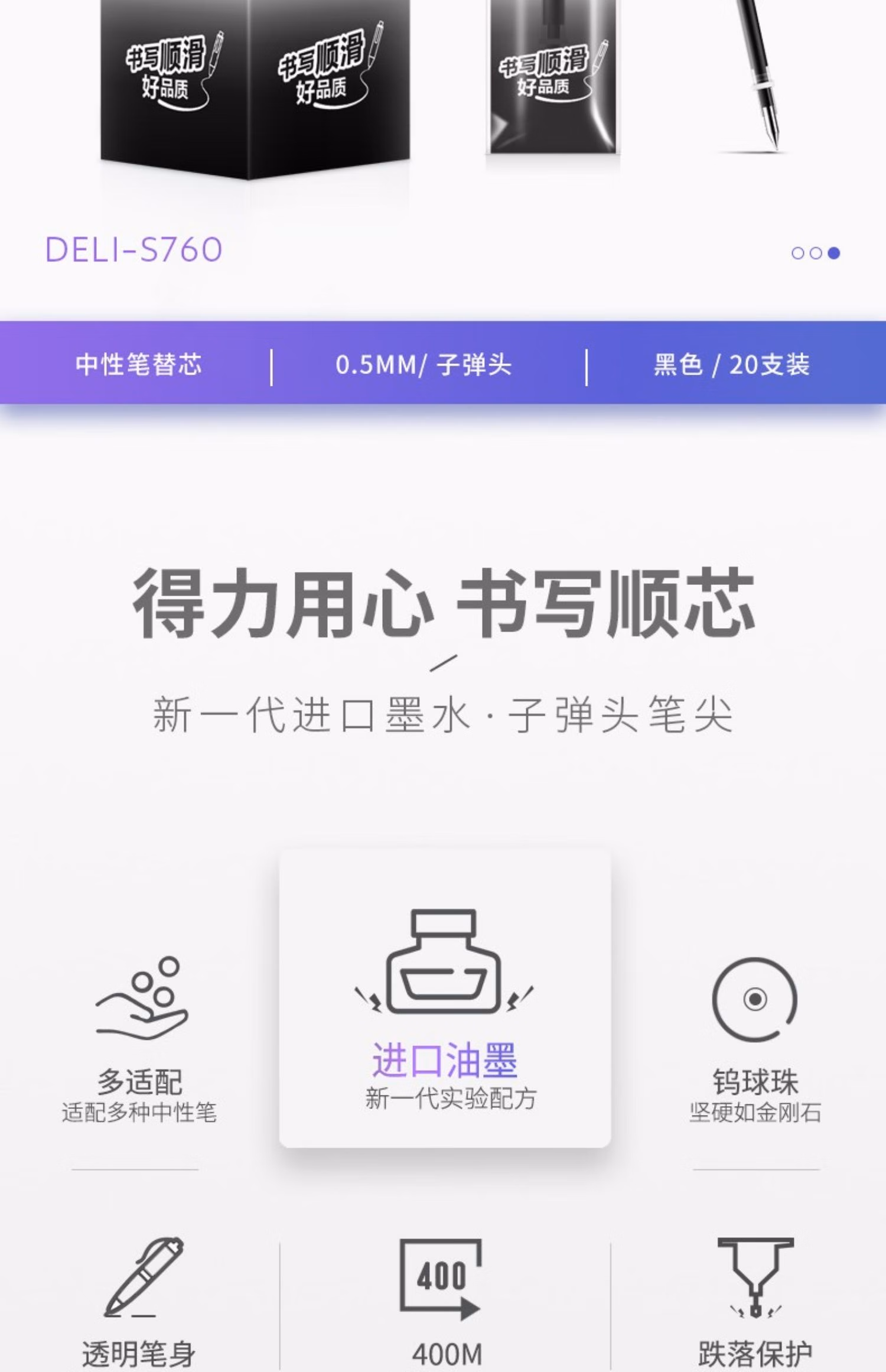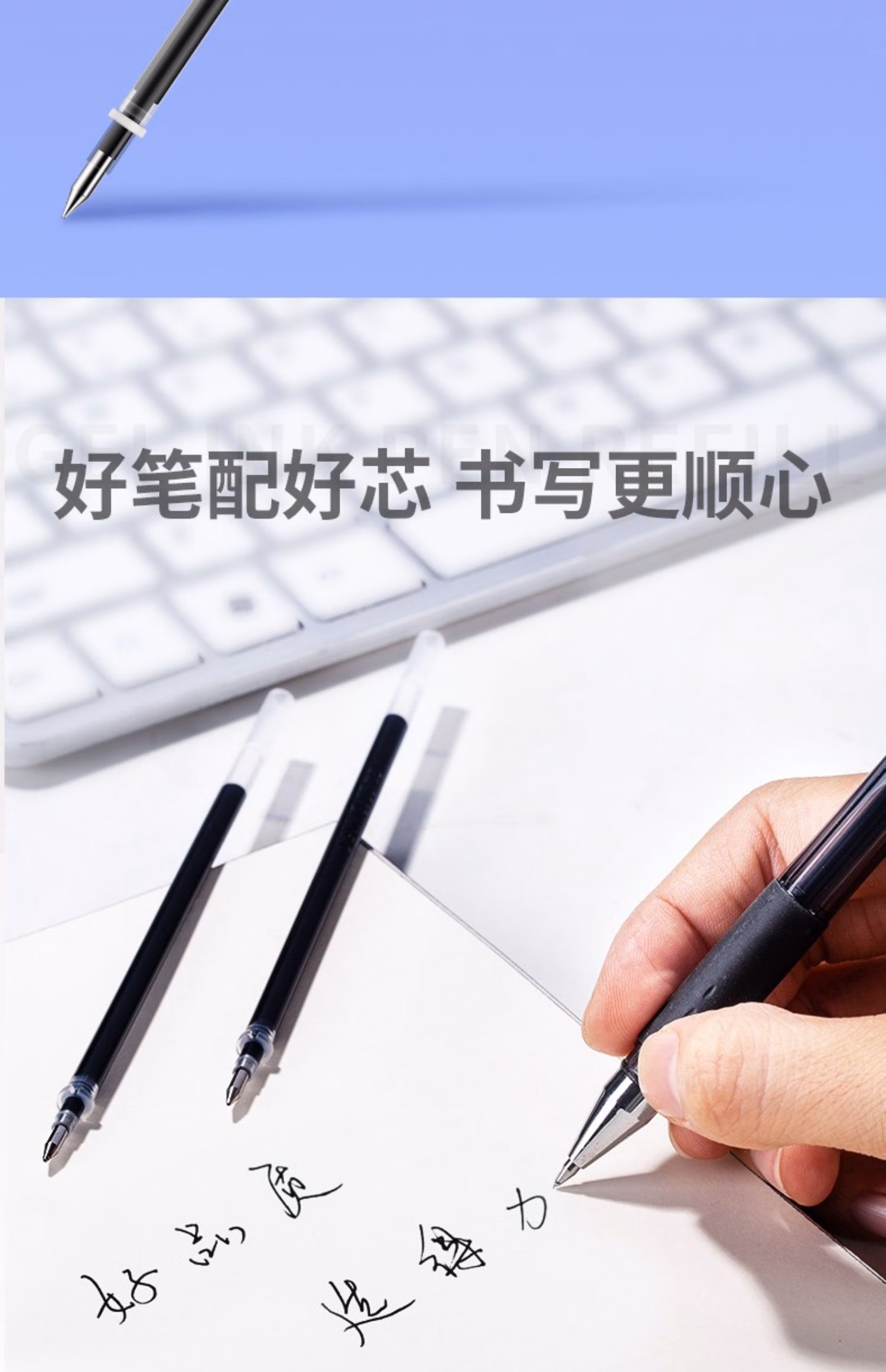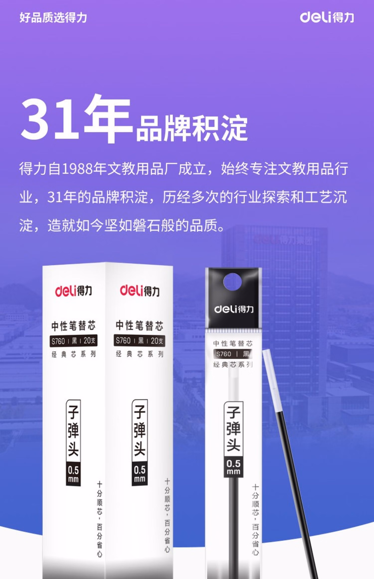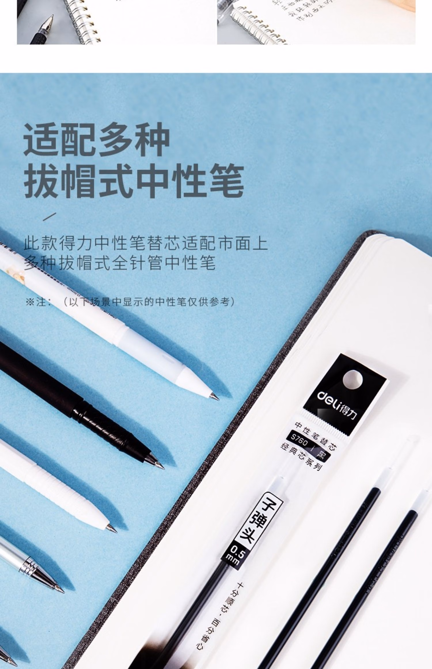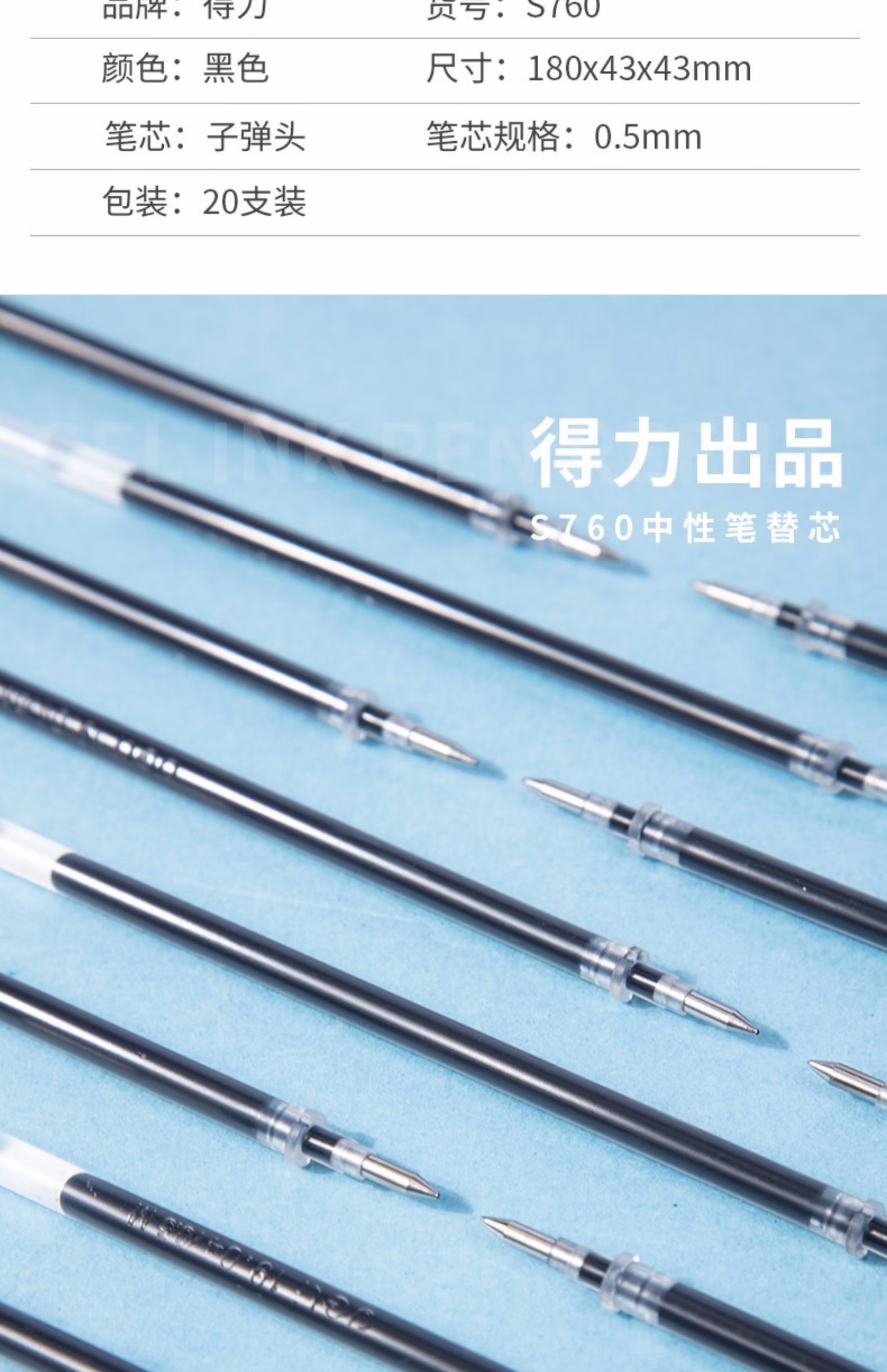 得力S760中性笔芯 0.5mm/0.7mm标准头水笔芯通用签字笔替芯 0.5mm黑色笔芯20支 S760