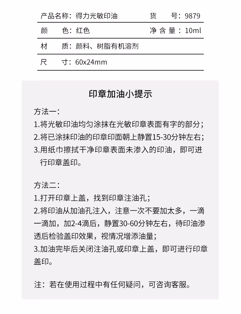 得力光敏印油9879【油性】【光敏】 印章/刻章/印台使用公章专用 光敏印油-红色