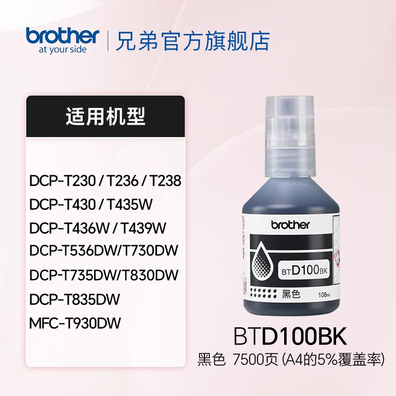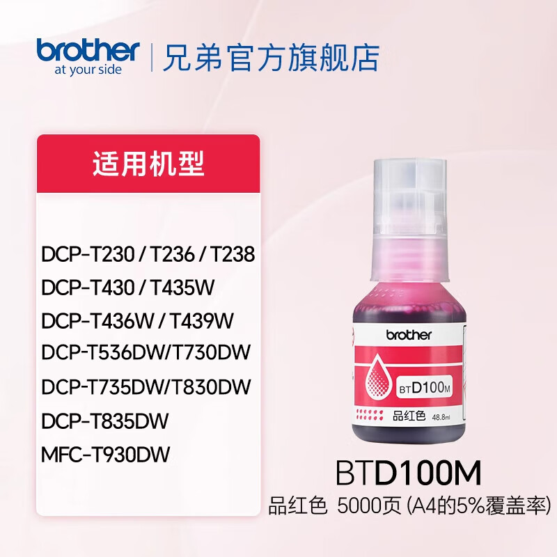 兄弟 BTD100BK CMY连供打印机四色原装墨水T435W T436W T536DW T735DW BTD100Y黄色,约5000页(48ml) 1瓶装