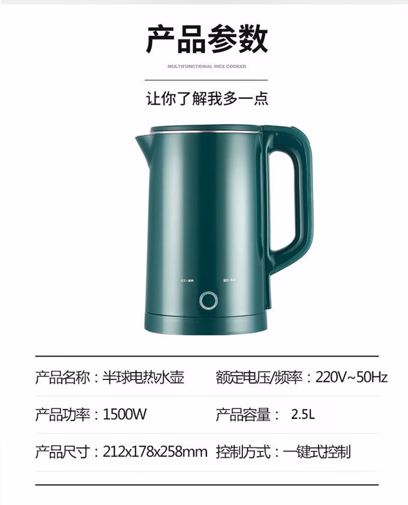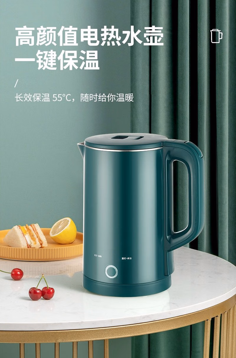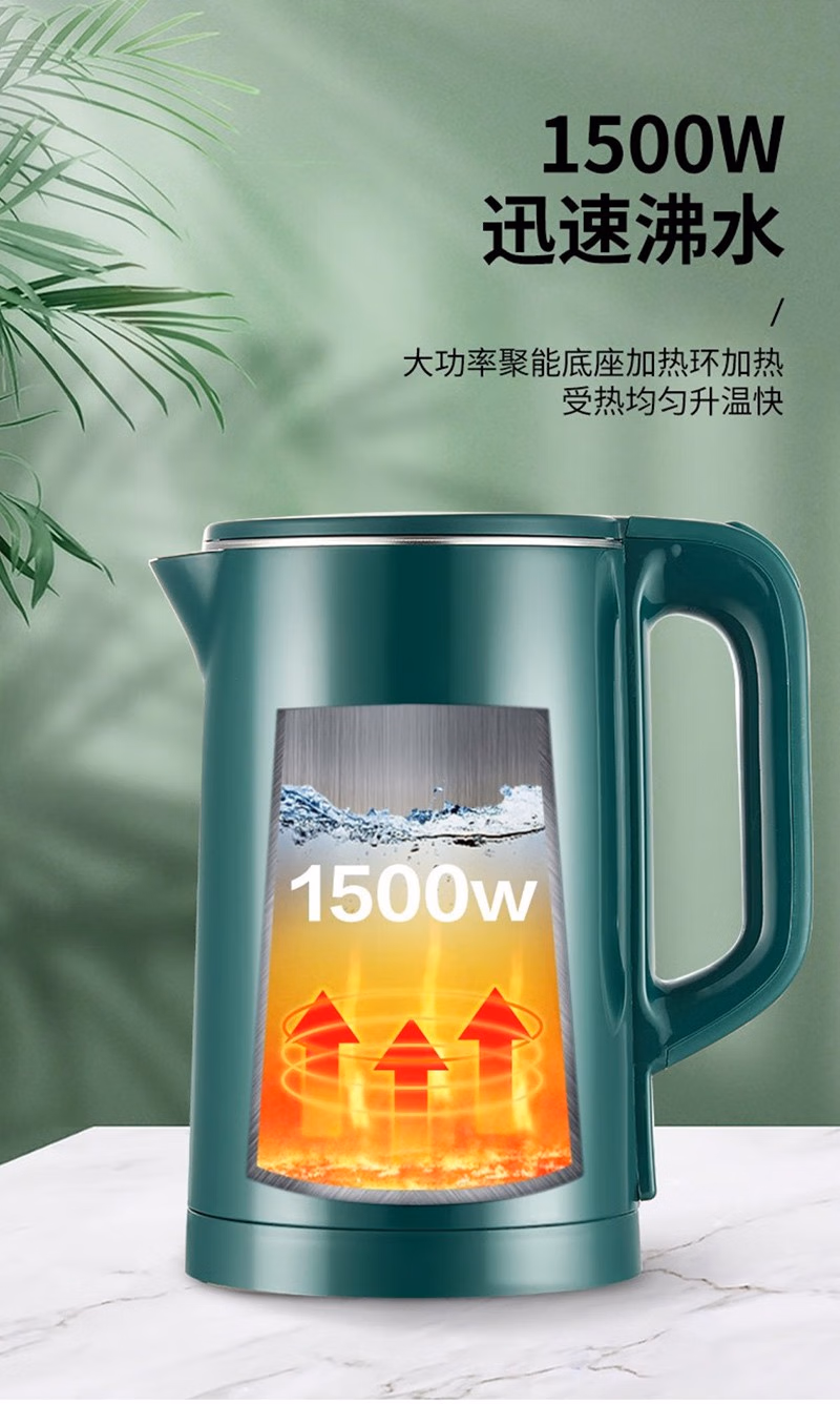 晟泰邦 电热水壶家用不锈钢热水壶双层防烫烧水壶大容量自动断电防干烧 2.5升绿色(无保温)单位:个