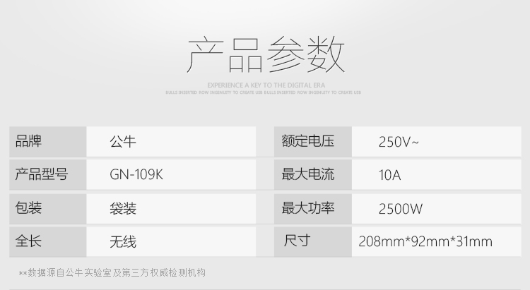 公牛 GN-109K 插线板 6位总控无线插座 5个起订 单位:个