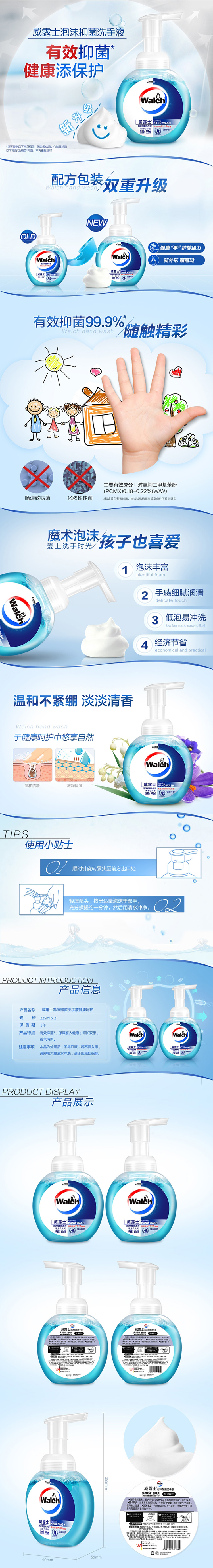 威露士Walch 225ml泡沫抑菌洗手液健康呵护2瓶装 计价 单位:组 10组起订